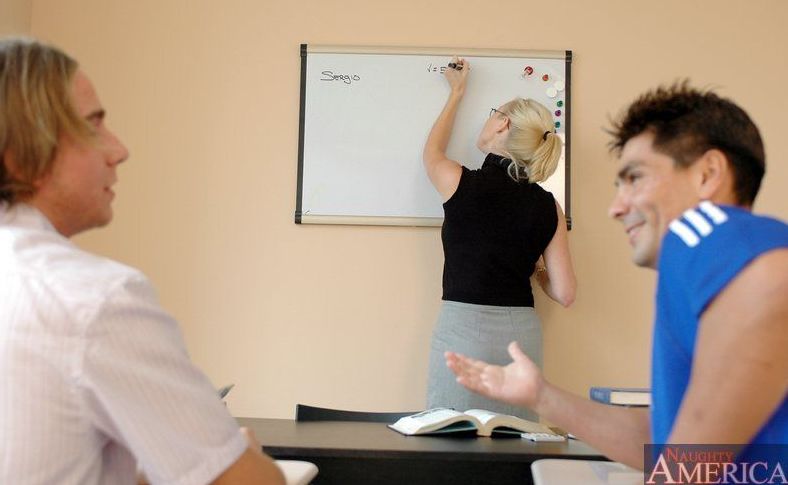 Sexy blonde teacher Adrianna Nicole taking cocks from two horny young students.