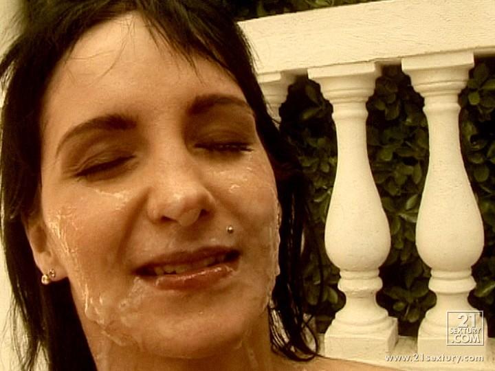 Babe gets surrounded by a bunch of well hung dudes, they cum on her cute little face with pleasure