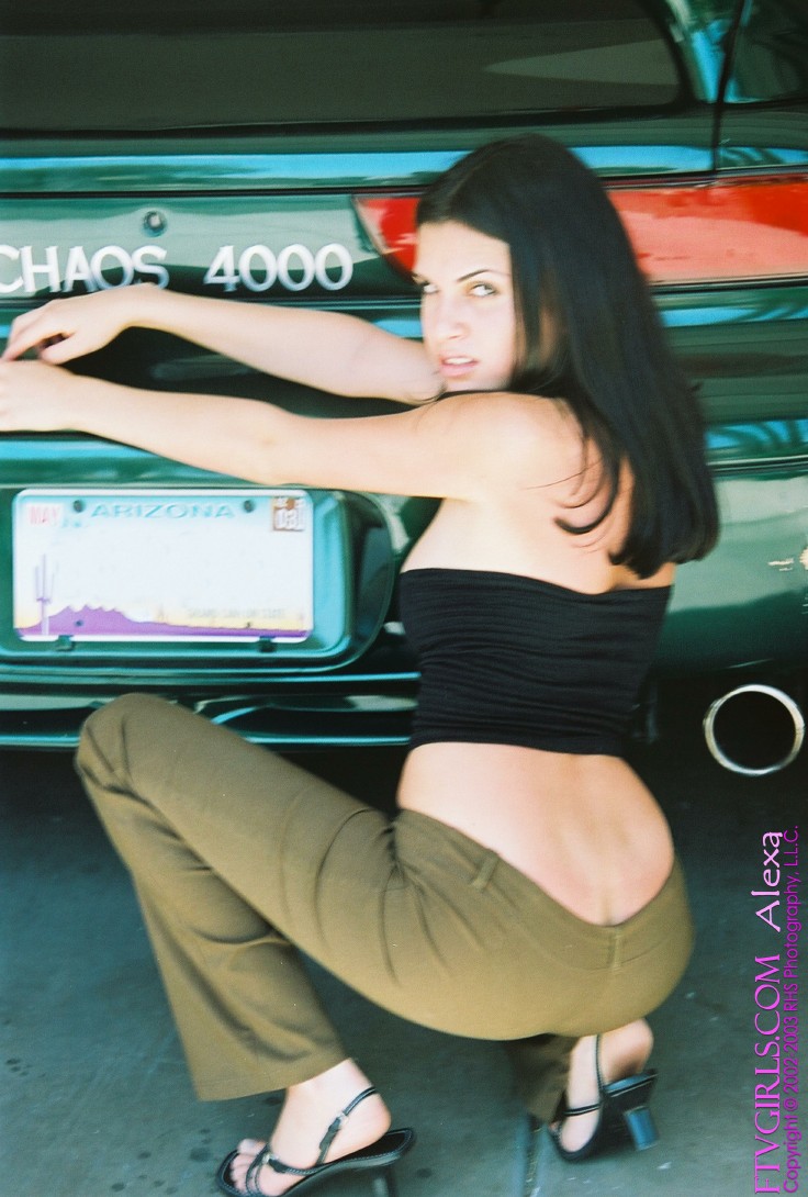 Slim brunette loves both her body and her car so much that she performs a striptease near it