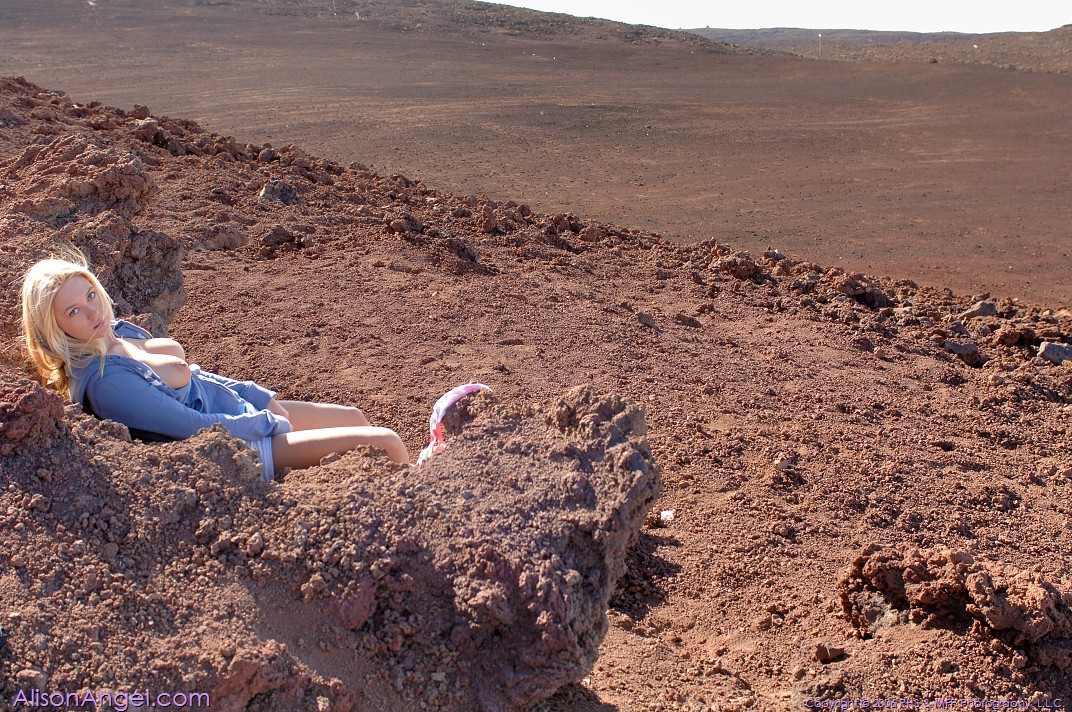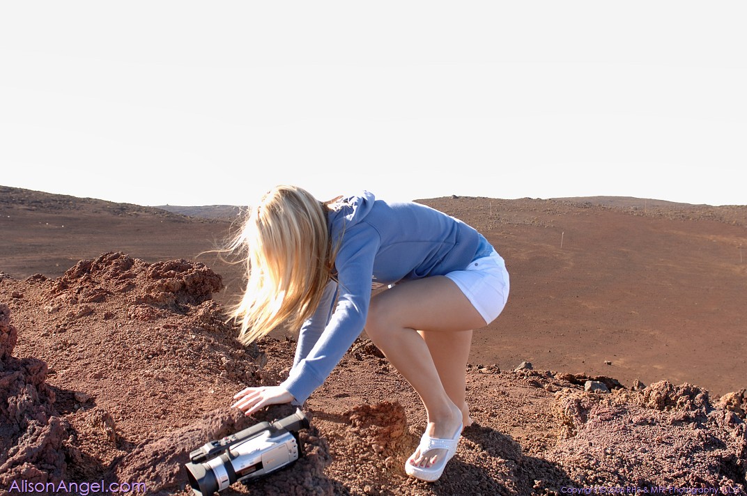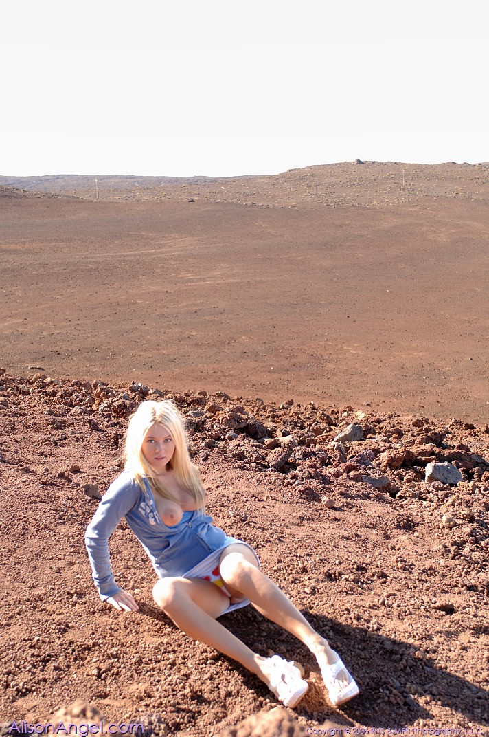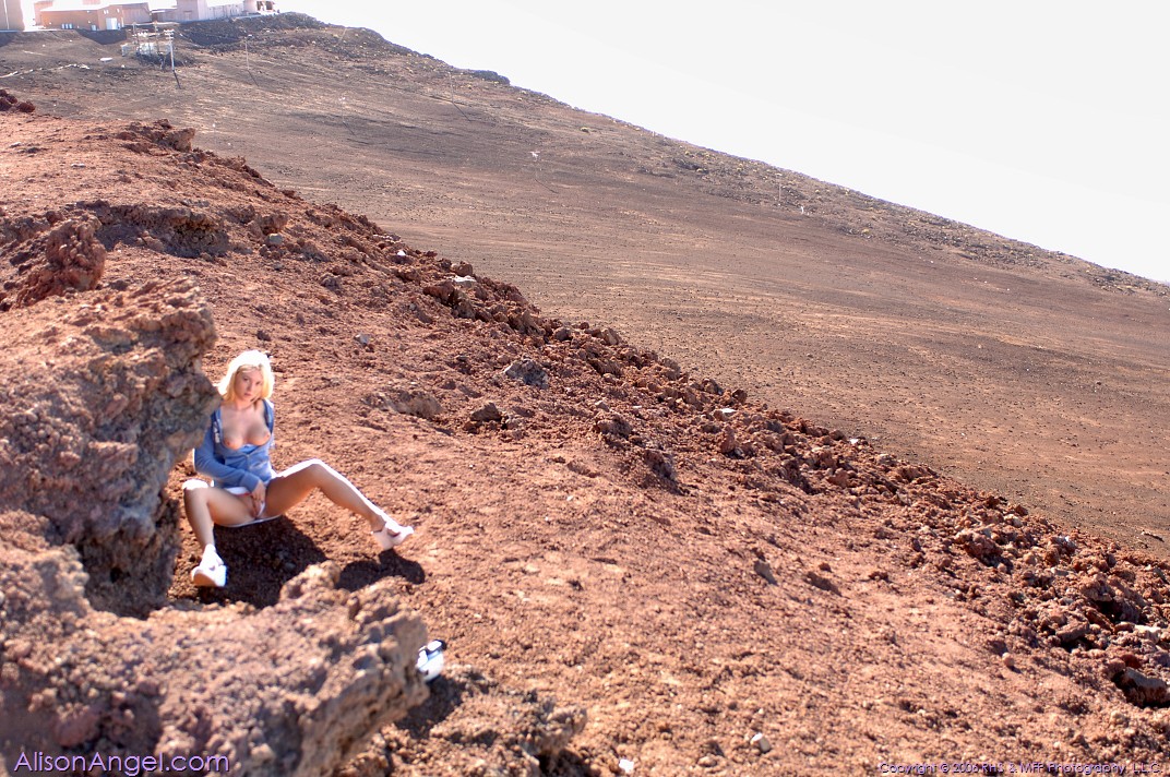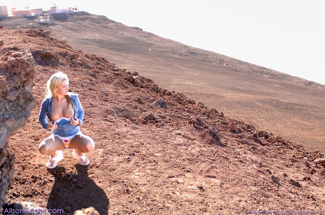 Alison Angel posing at the hills and gets rid of her shirt, showing her cute tits.