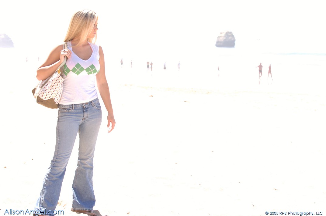 Alison Angel posing at the local beach, shows her ass and shows her lickable nipples.
