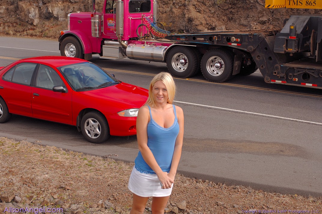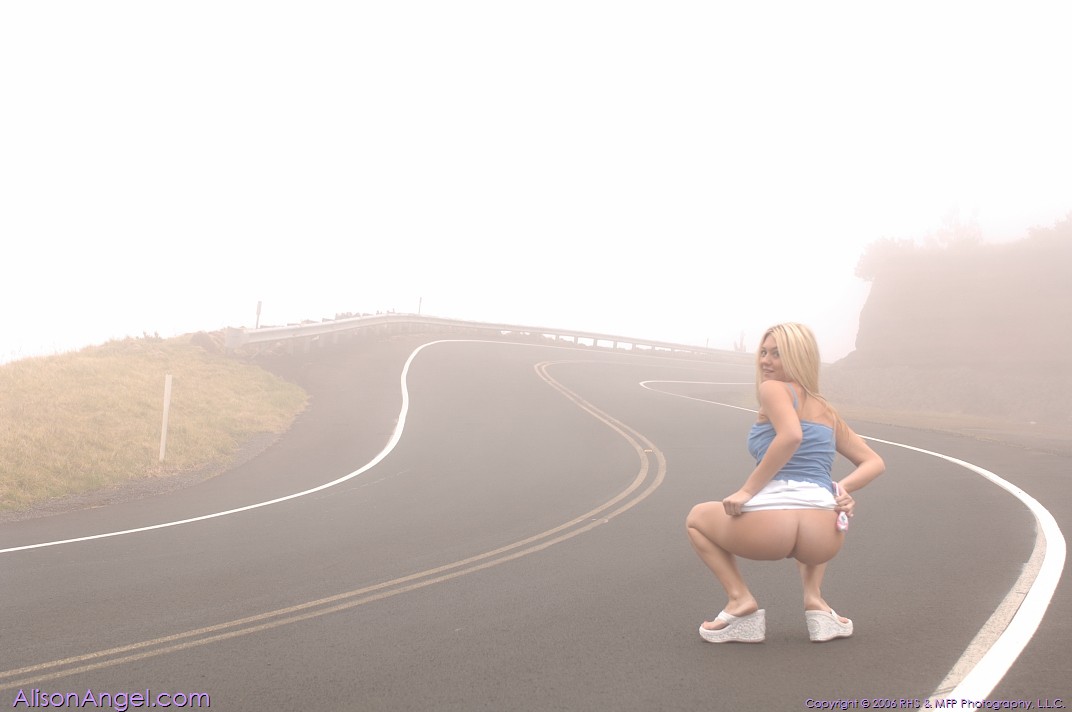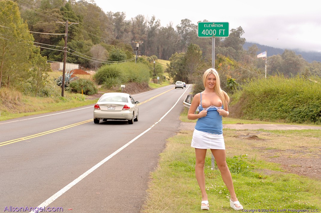 Alison Angel standing on the road and flashes her big boobies and nasty pussy.