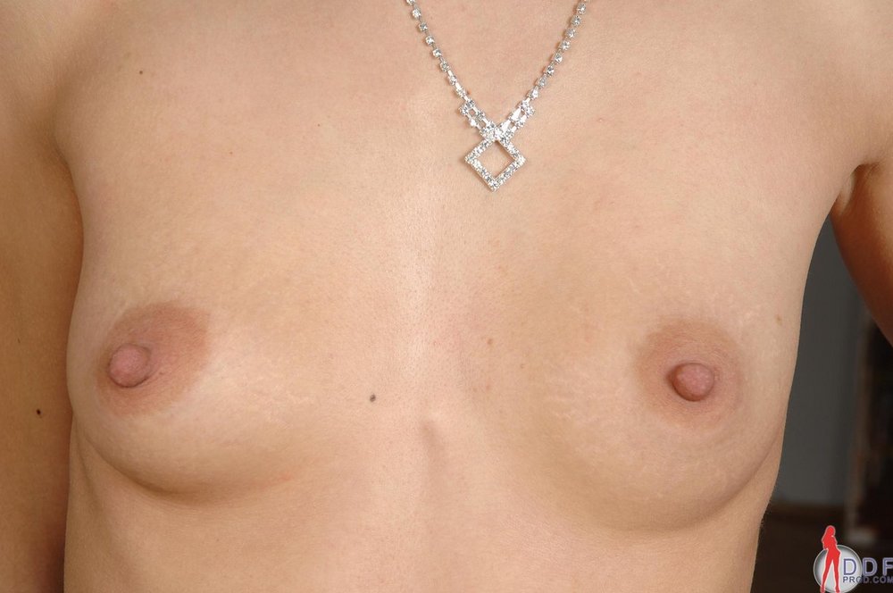 Good looking brunette Amanda Vamp with small boobies stripping her pink underwear.
