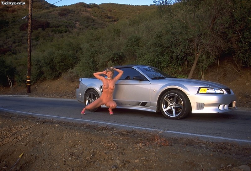Busty blonde babe Amy Easton strips her clothes outdoors and shows her big jugs.