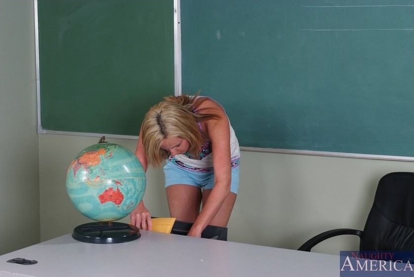 Turned on blonde school girl Amy Moore with nice body and shaved pussy gets nailed.