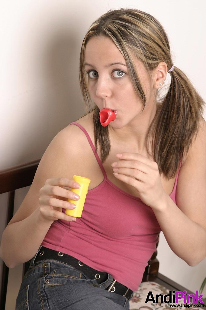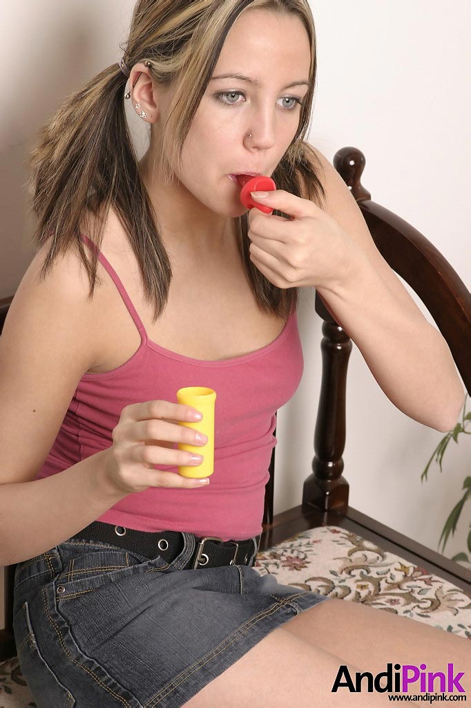 Pigtailed teen gal Andi Pink takes off her denim mini skirt and shows her fresh pussy.