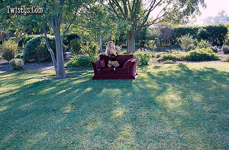 Classy blonde lady Angel Cassidy strips outdoors and teases in corset and stockings.