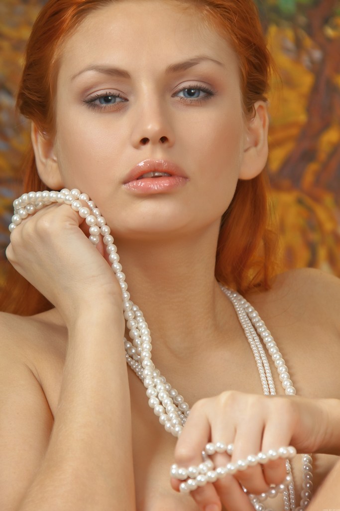 Ginger hottie, Angela D, caresses her naked body and her feet with long beads.
