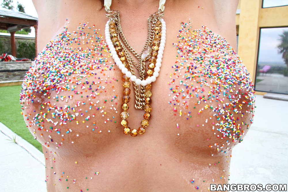 Busty and curvaceous babe covered in sprinkles takes a big cock into her ass.