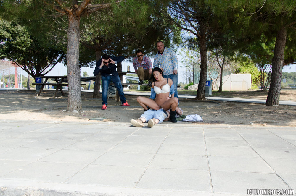Wild Latina shows off her big boobs in public before getting spooned in a park for an audience.