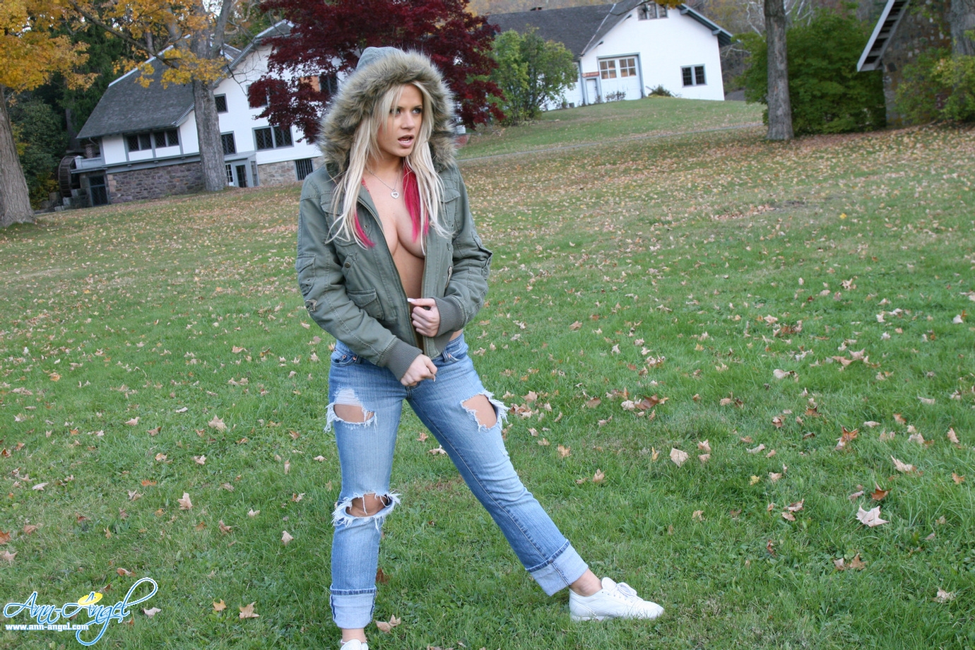 Cute blonde Ann Angel strips outside, in public, and teases with her hot tits and tasty ass.