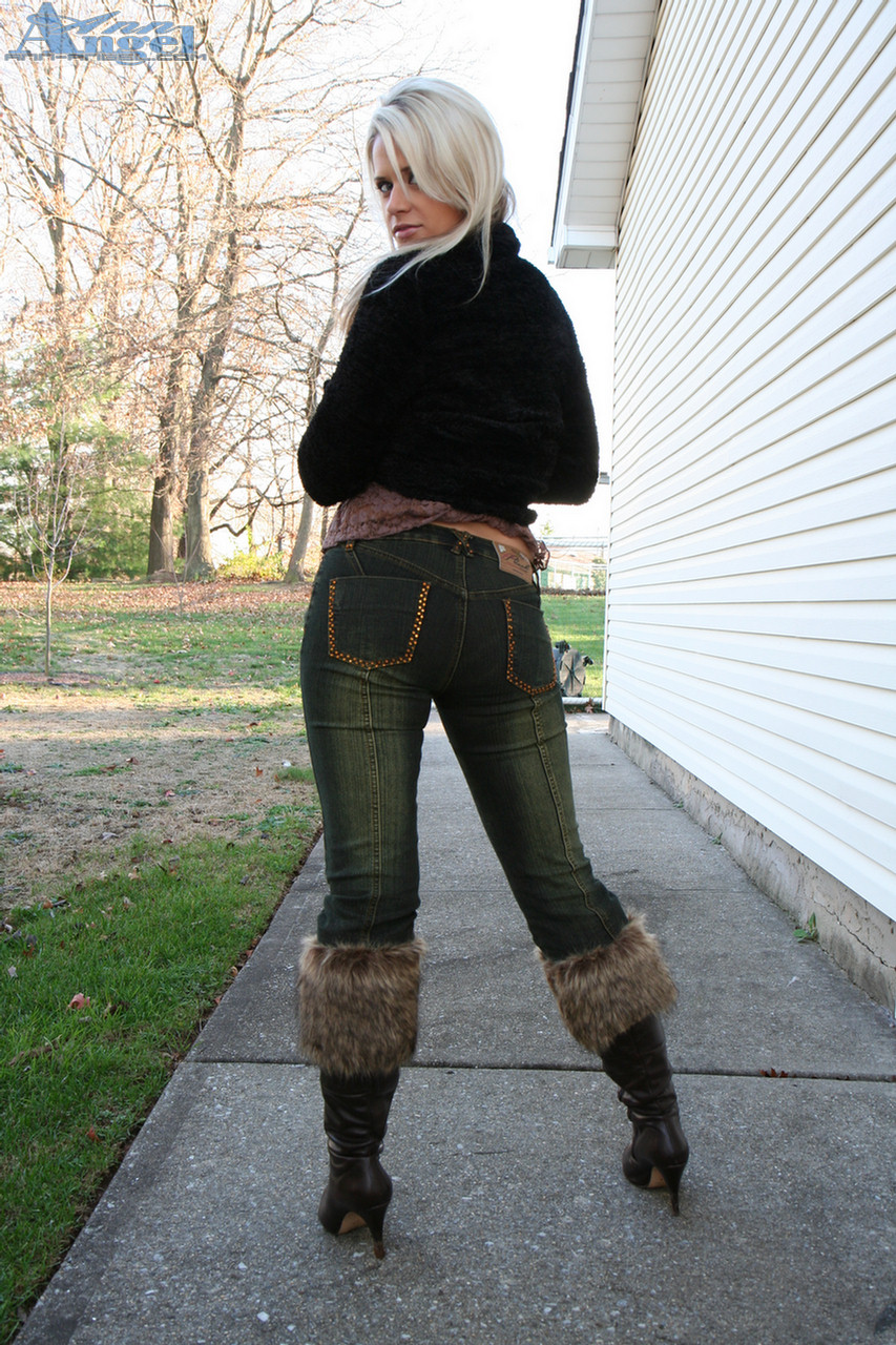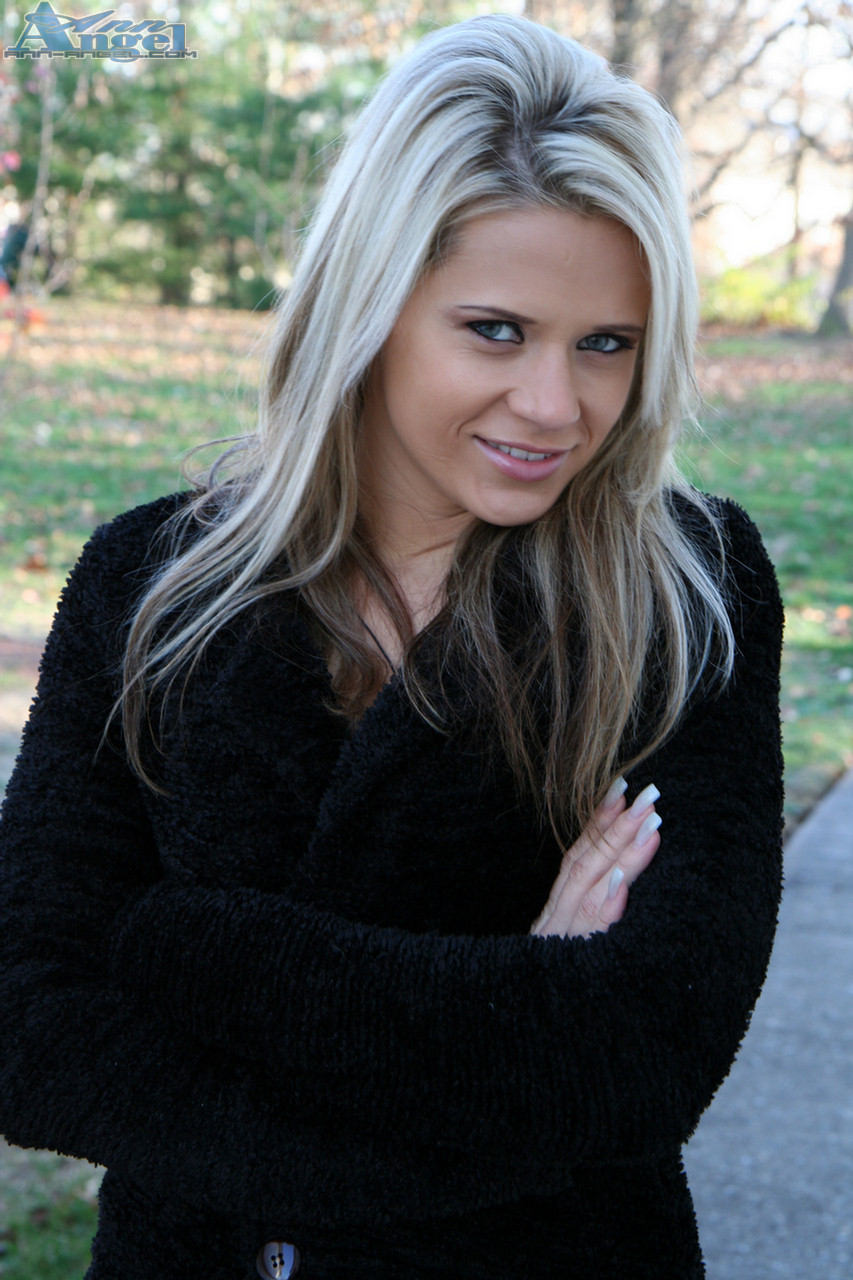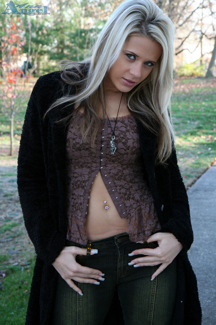Ann Angel takes all of her clothes outdoors and teases us with her firm boobs.