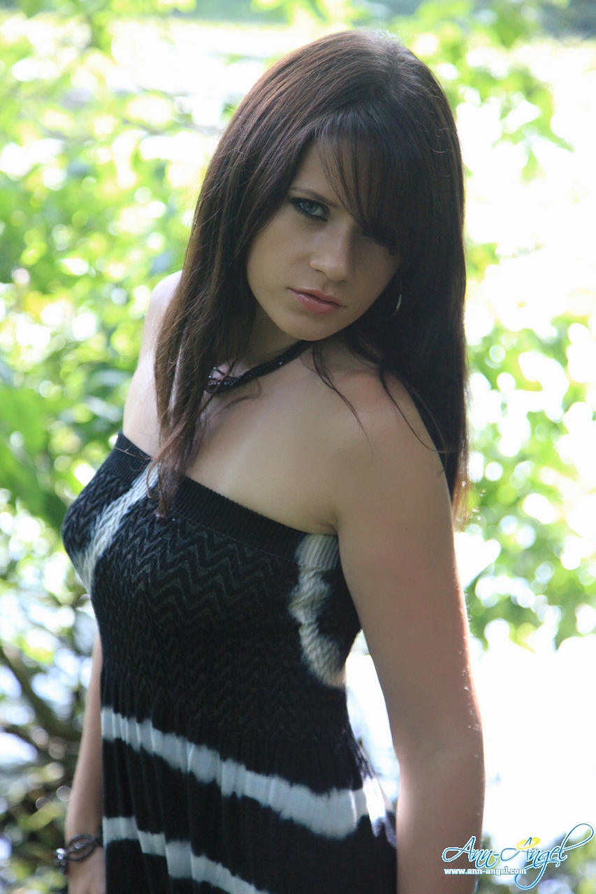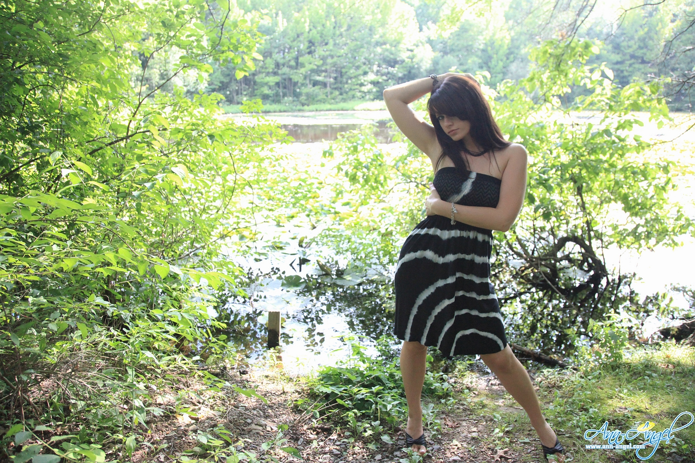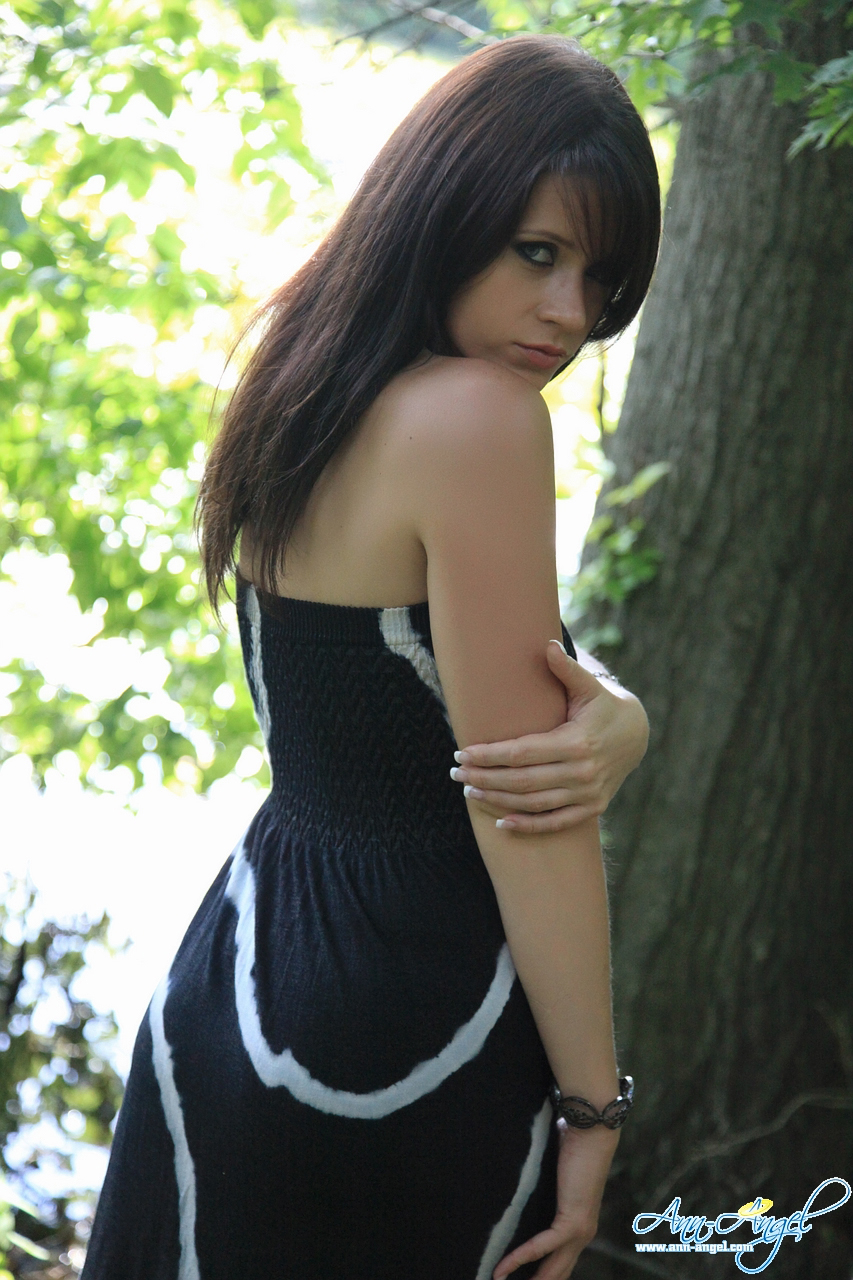 Ann Angel takes her black dress outdoors in the woods and shows us her hot booty.