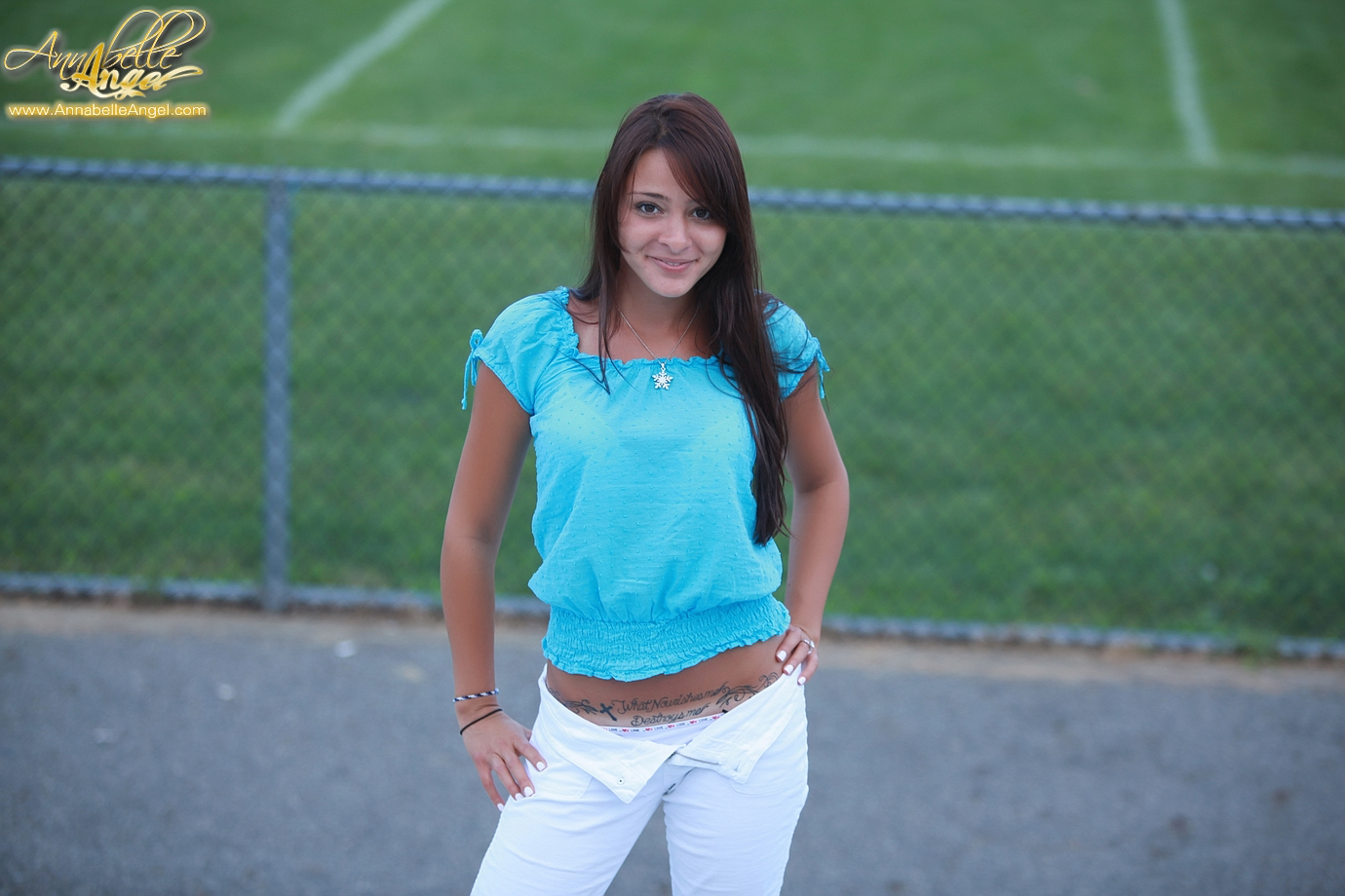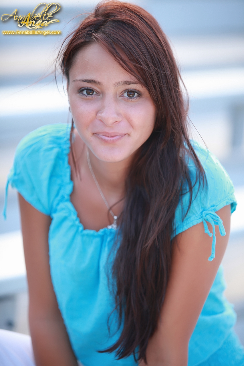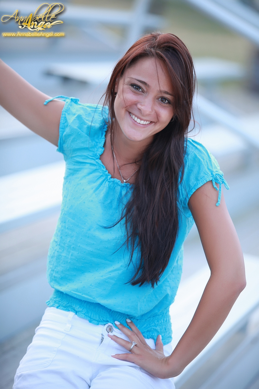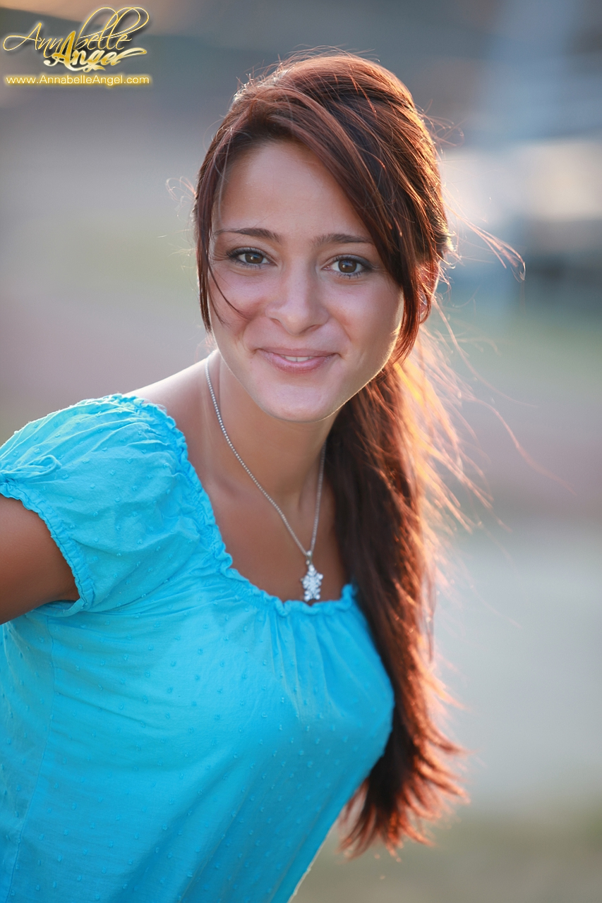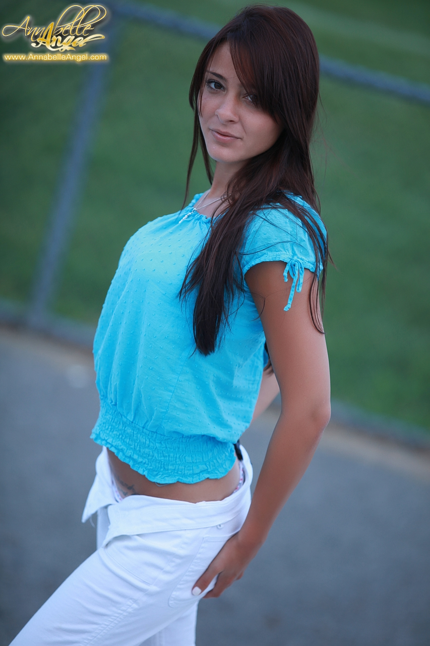 Annabelle Angel slowly takes her blue shirt outdoors and shows her hot body.