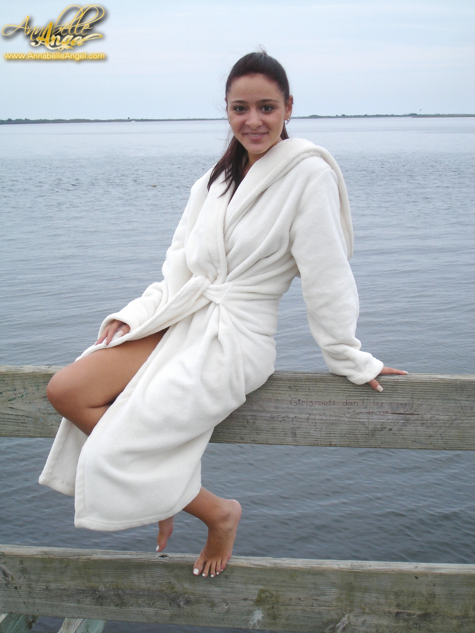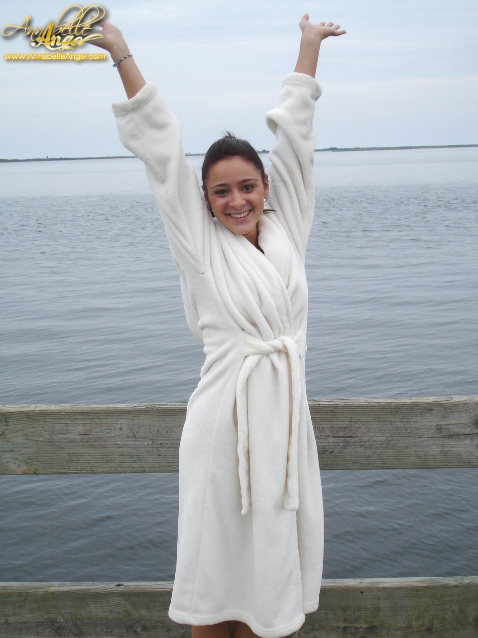 Annabelle Angel strips her sexy white coat outdoors and shows us her breasts.