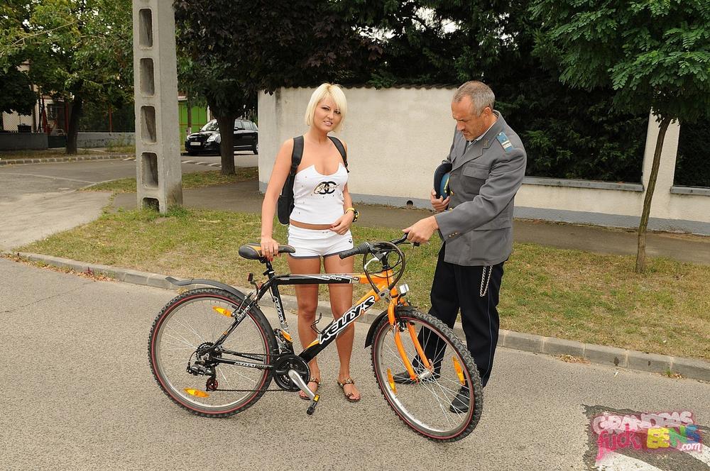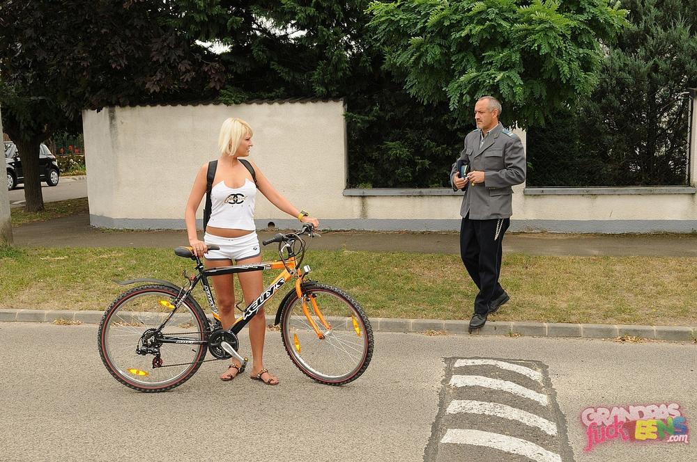 Older man catches a sexy blonde on a bicycle and punishes her holes with his fat cock
