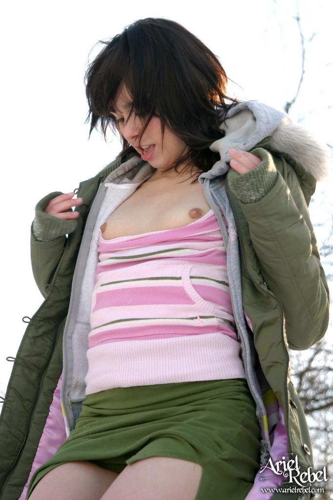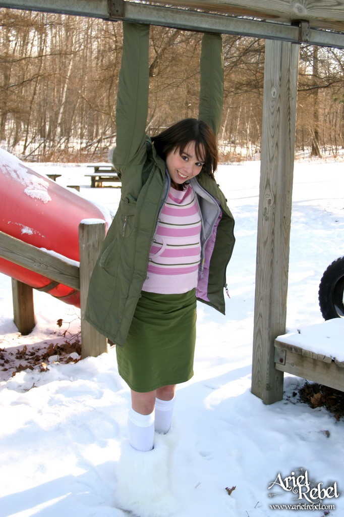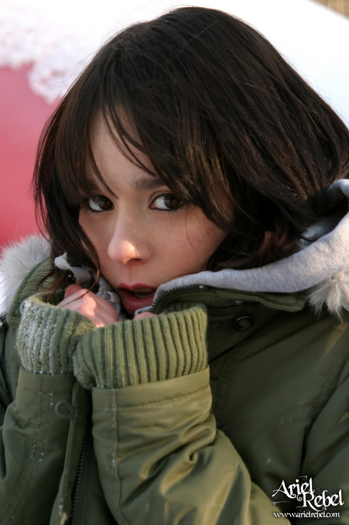 Hot Ariel Rebel performs a striptease in the snow just to cool her burning slit off.