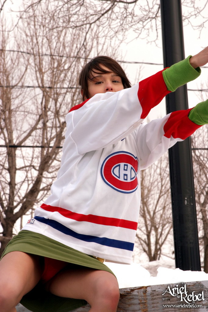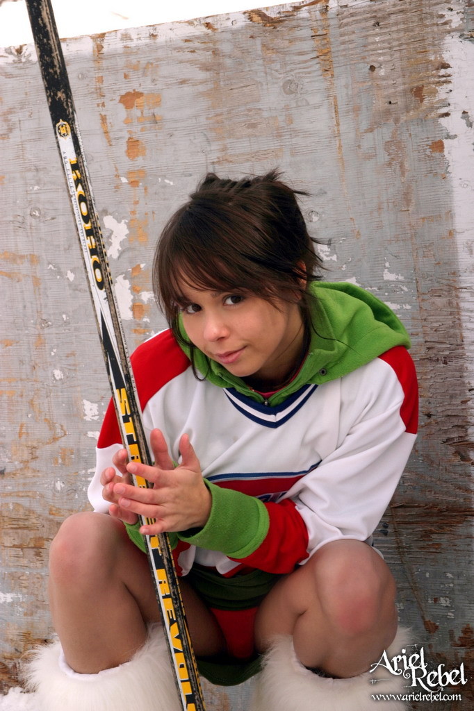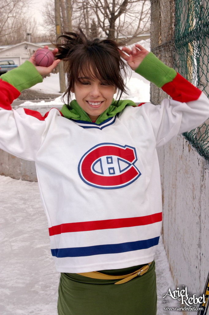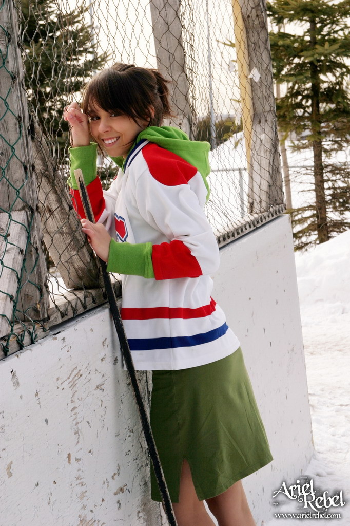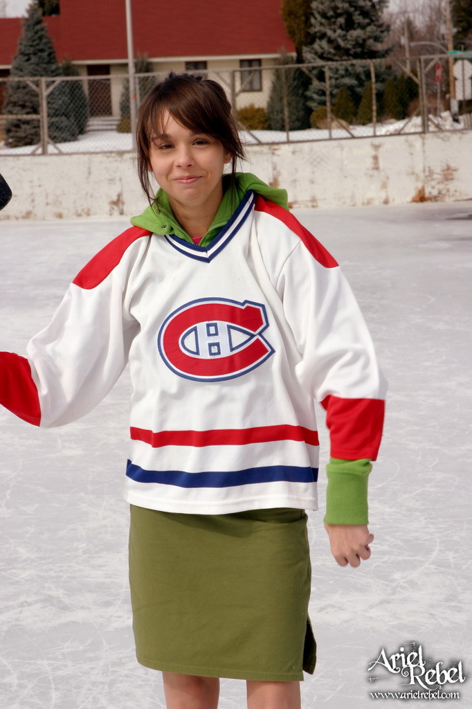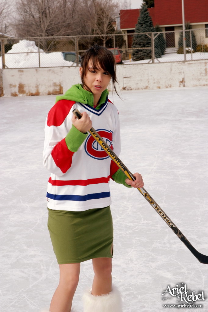 Seductive Ariel Rebel goes out on a skating-rink to play kinky hockey in mini skirt.