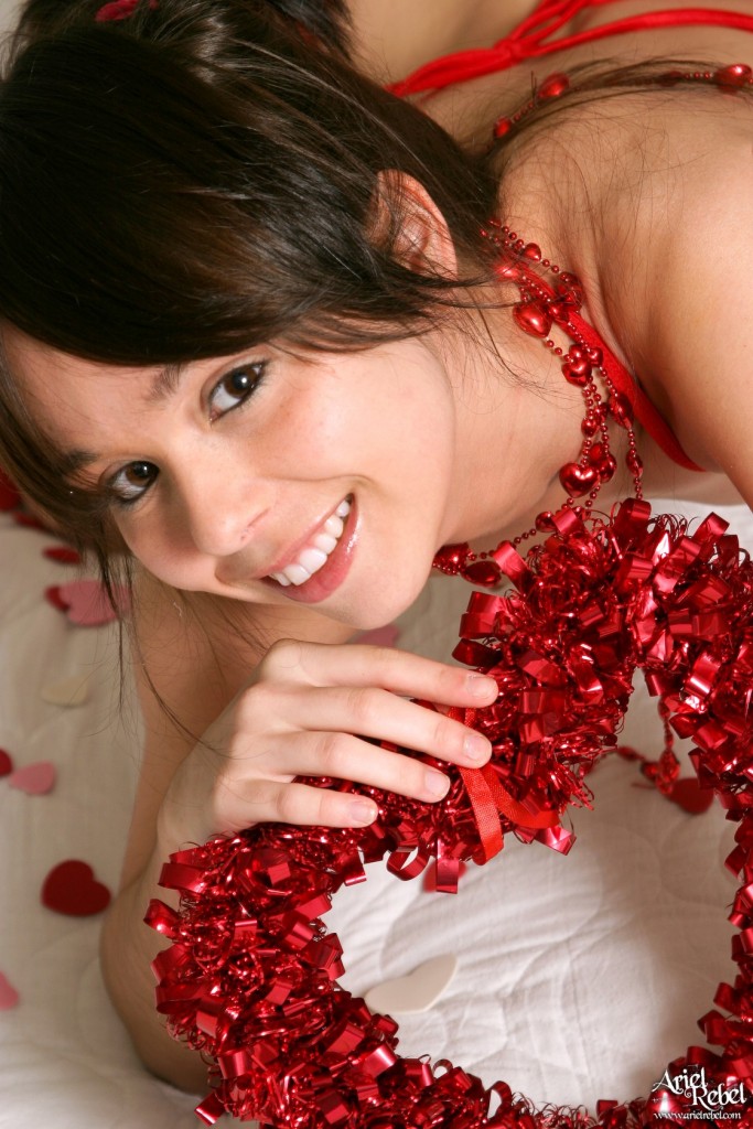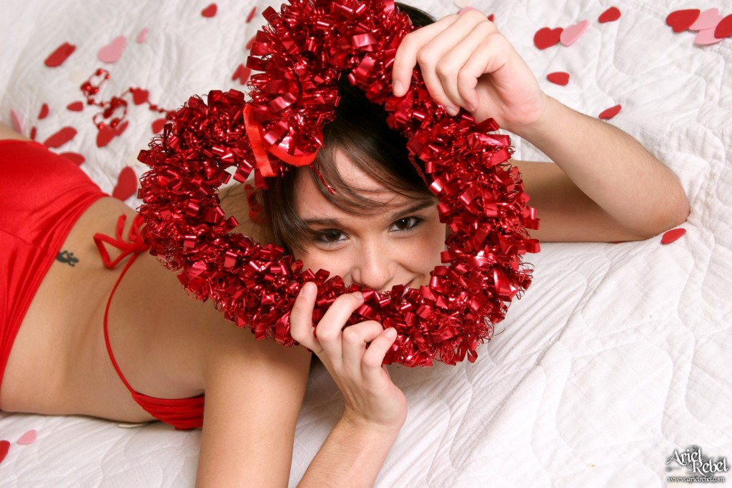 Ariel Rebel plays on her bed between red petals and shows off her cute tits.
