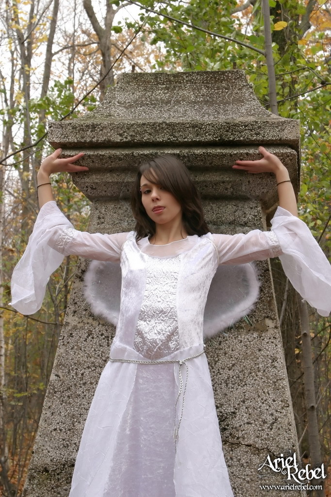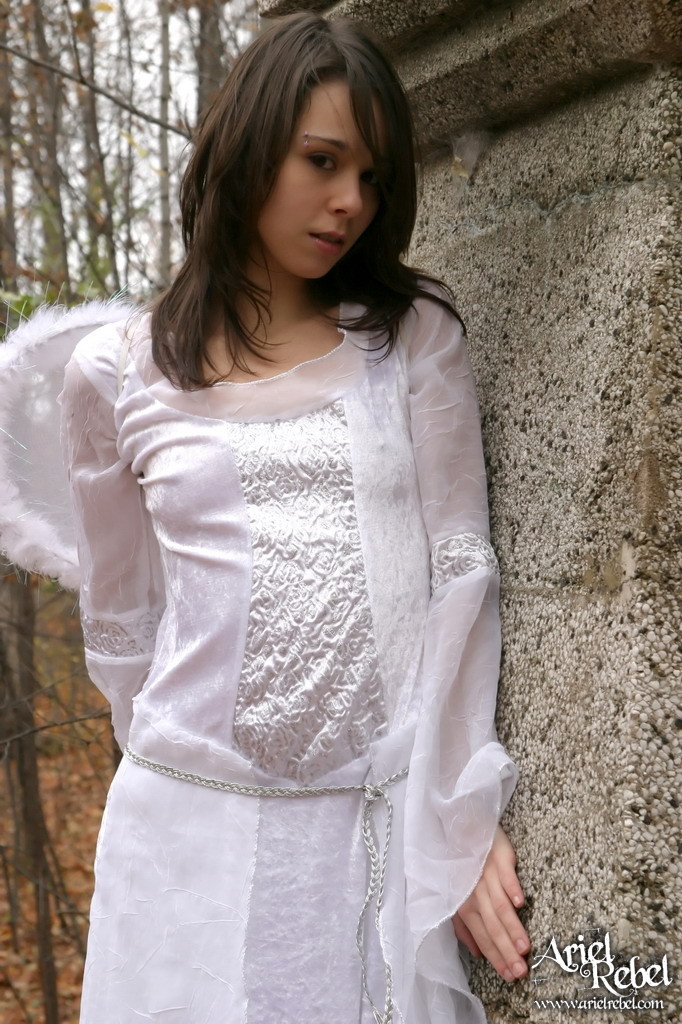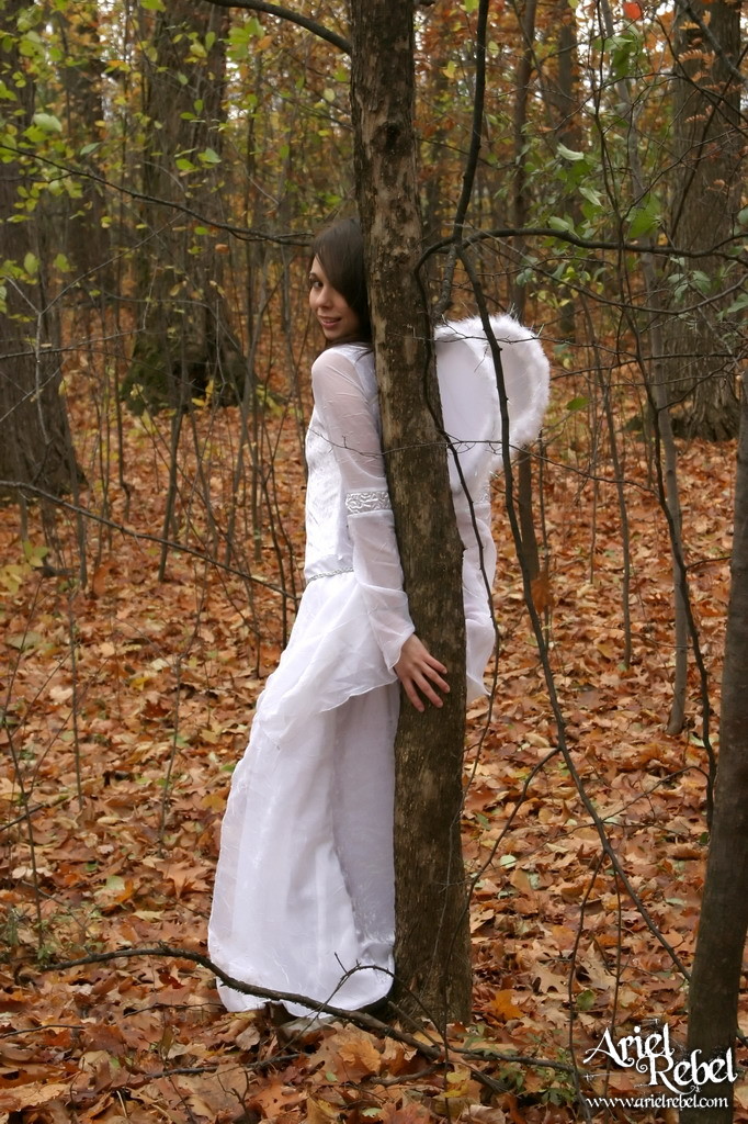Cute and sexy babe, Ariel Rebel posinfg in the woods in her sexy white angel outfit.