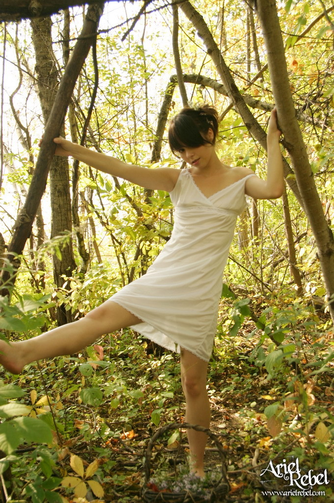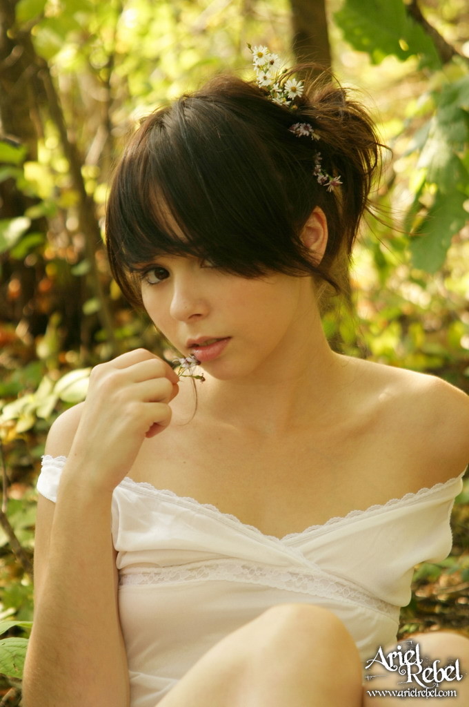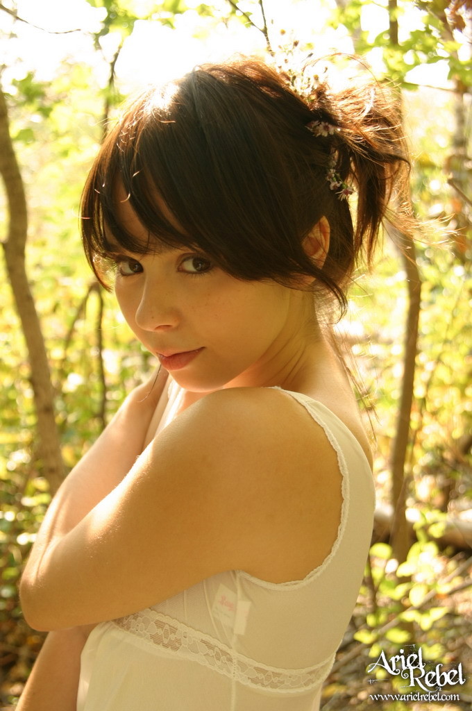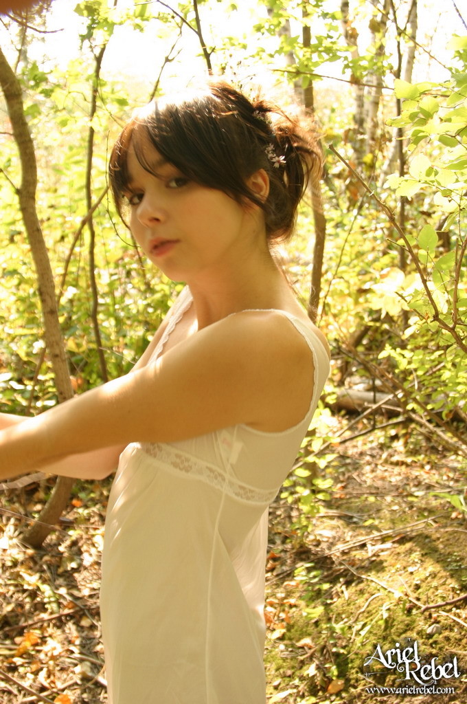 Cute brunette babe Ariel Rebel posing in the forrest and flashing her tiny tits.