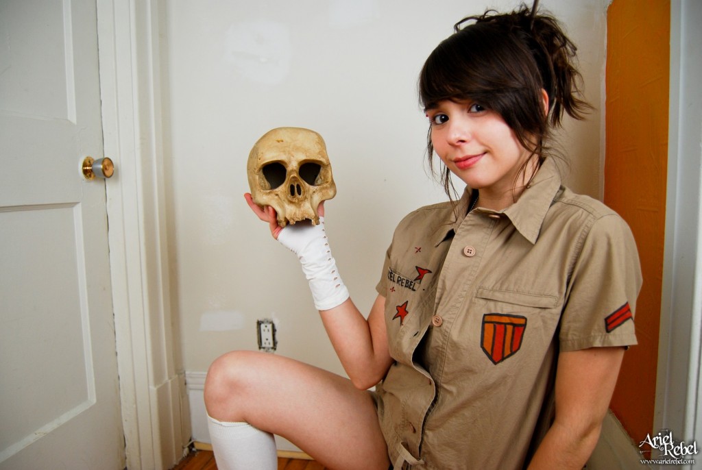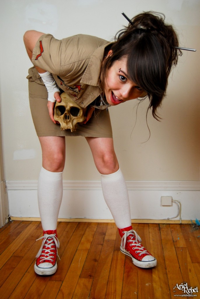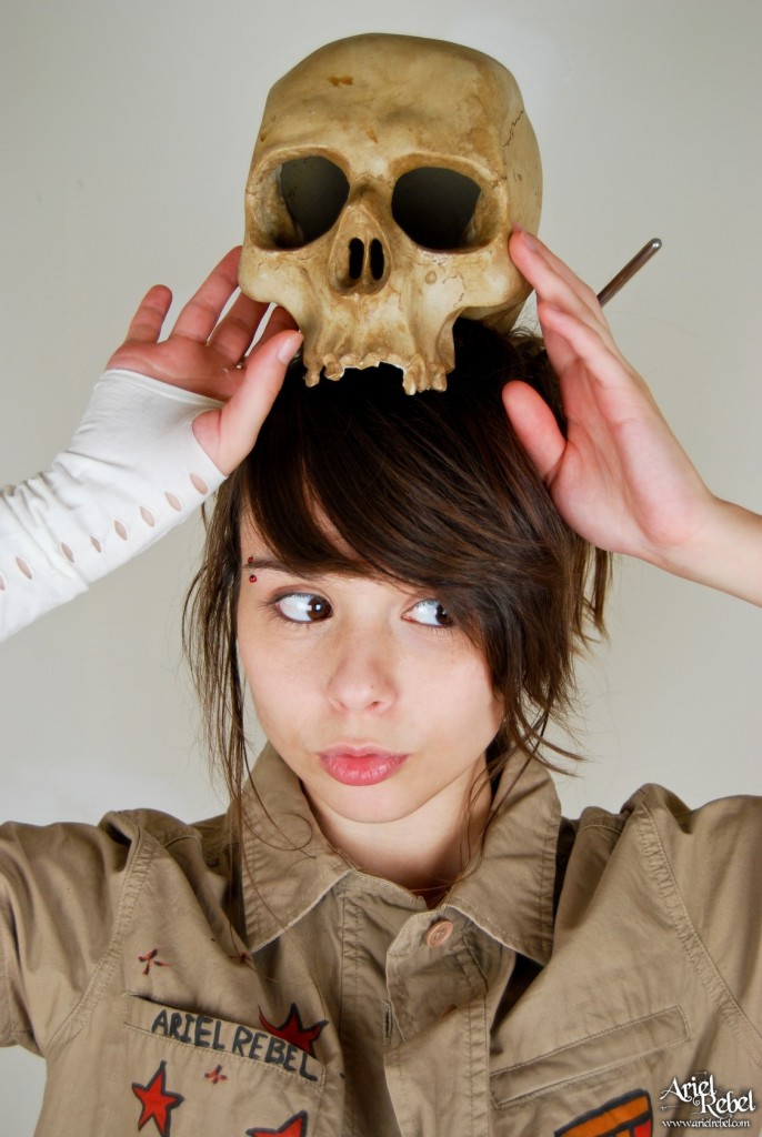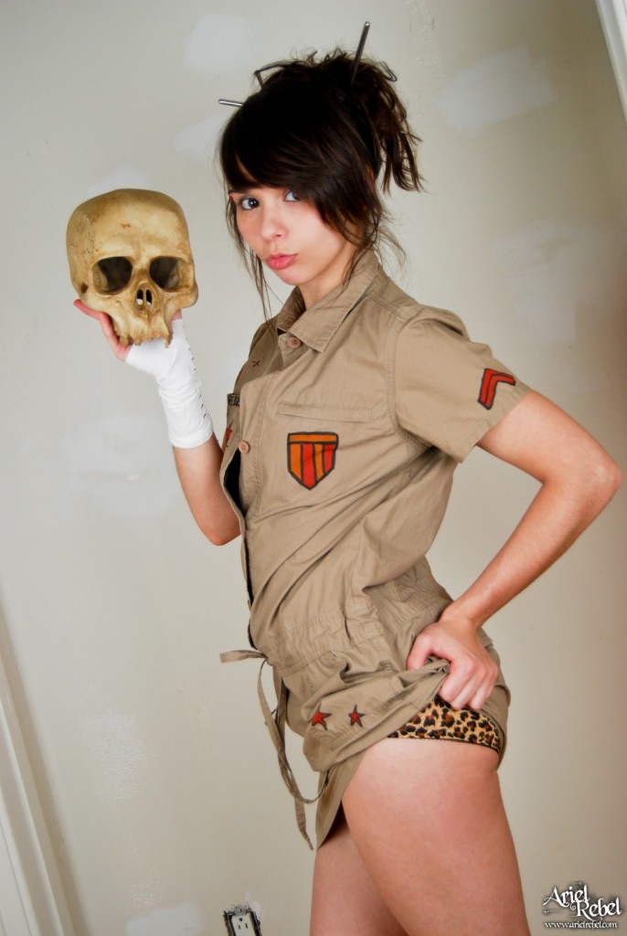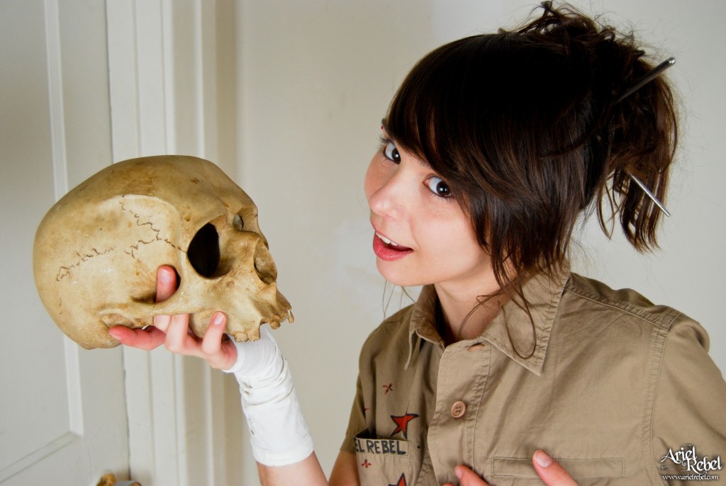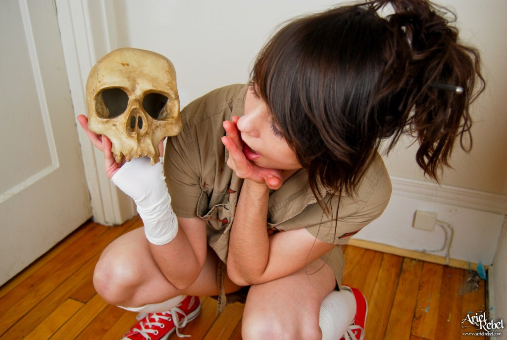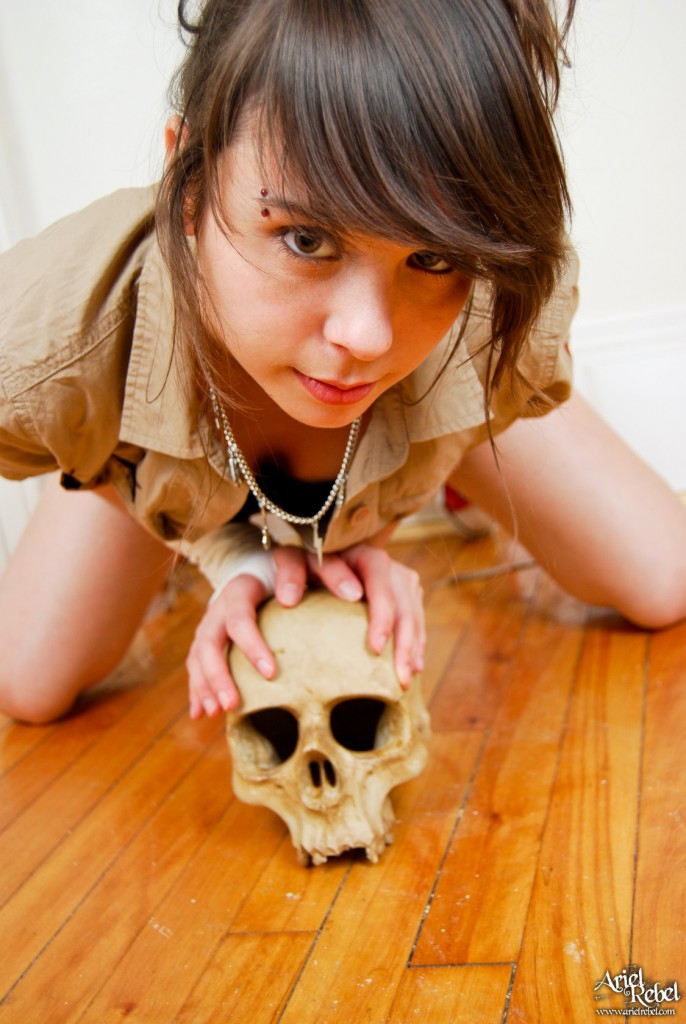 Horny Ariel Rebel posing with a skull while wearing her amazingly sexy clothes.