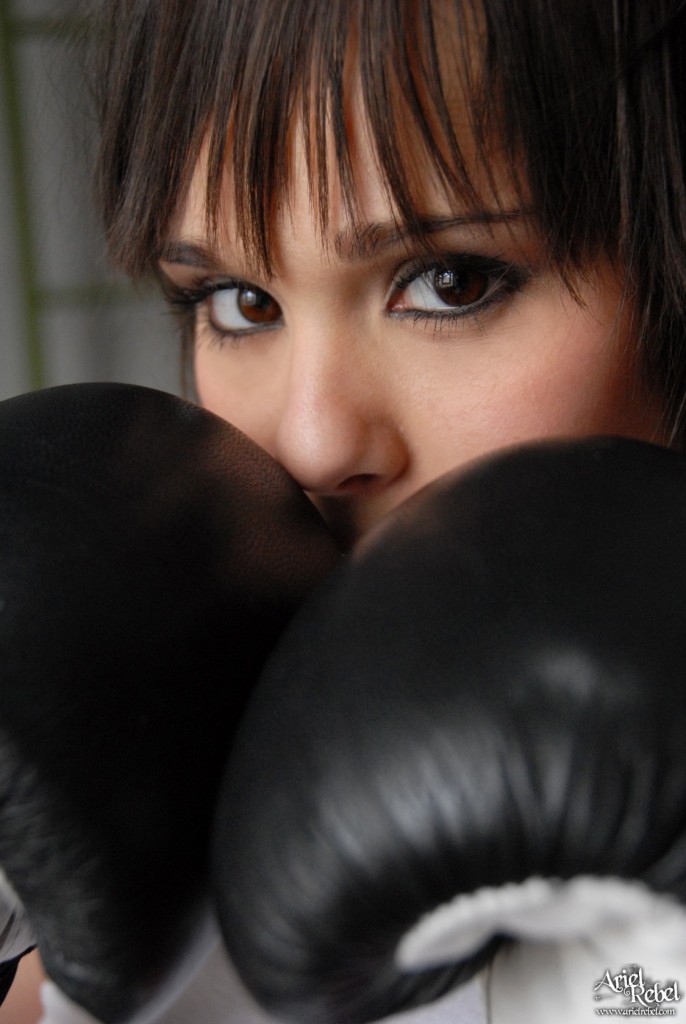 Sporty Ariel Rebel shows her slit and firm tits after enjoying a boxing match.