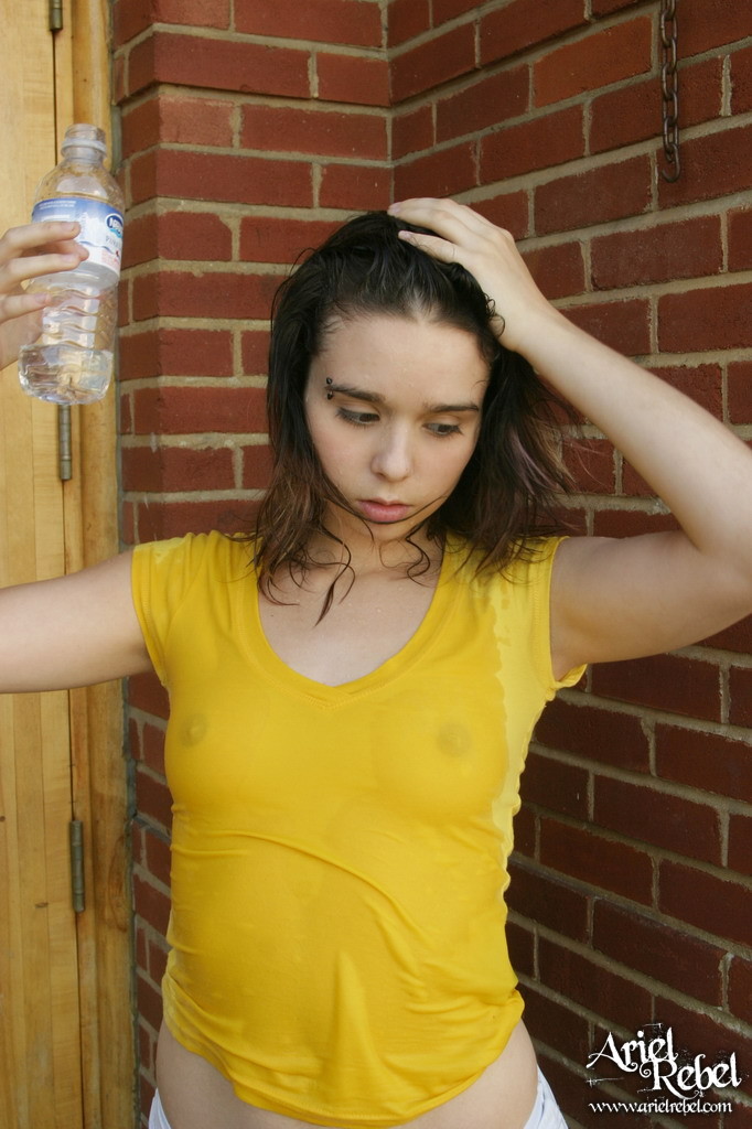 Ariel Rebel pours water on her clothes on a hot day to make a wet shirt action.