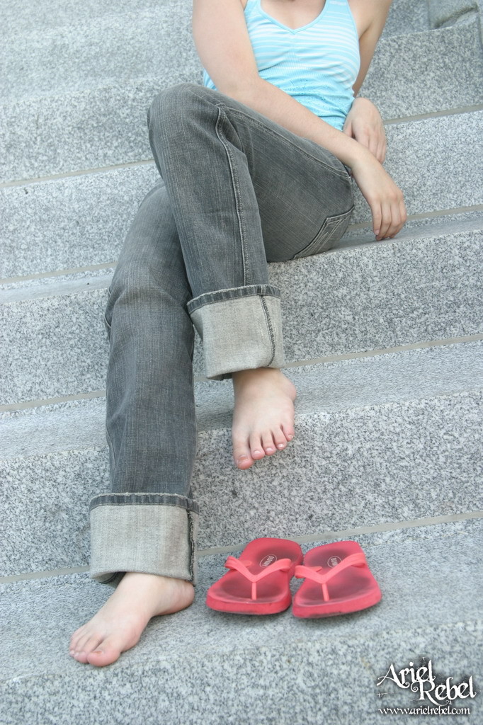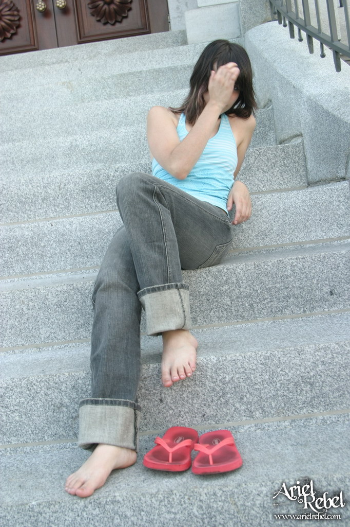 Sweet Ariel Rebel shows off her soles on the stone stair-case of a public building.