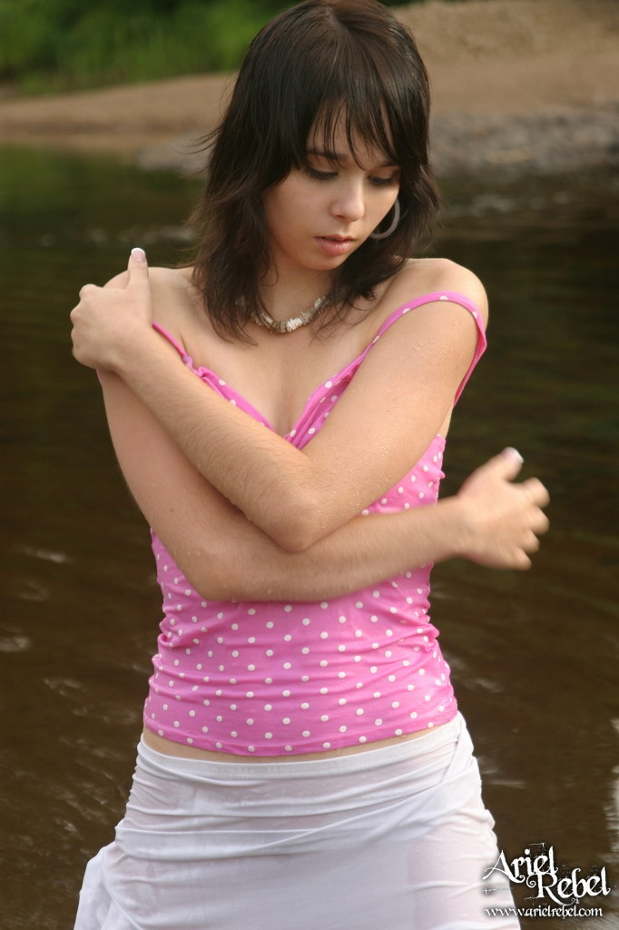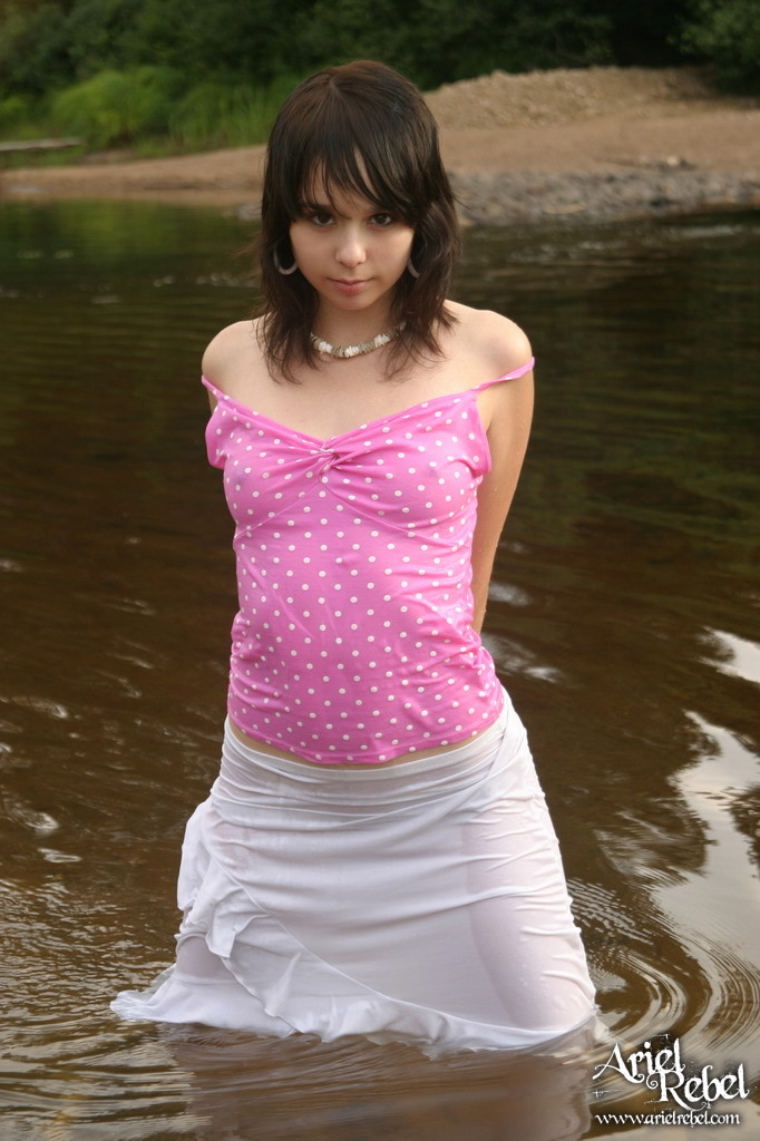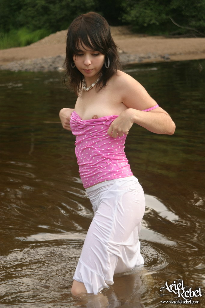 When naughty Ariel Rebel has no bikini on her, she swims in her usual clothes.