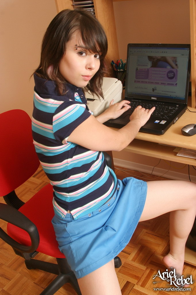 Ariel Rebel doesn't forget to rub her slit even when working at a computer.