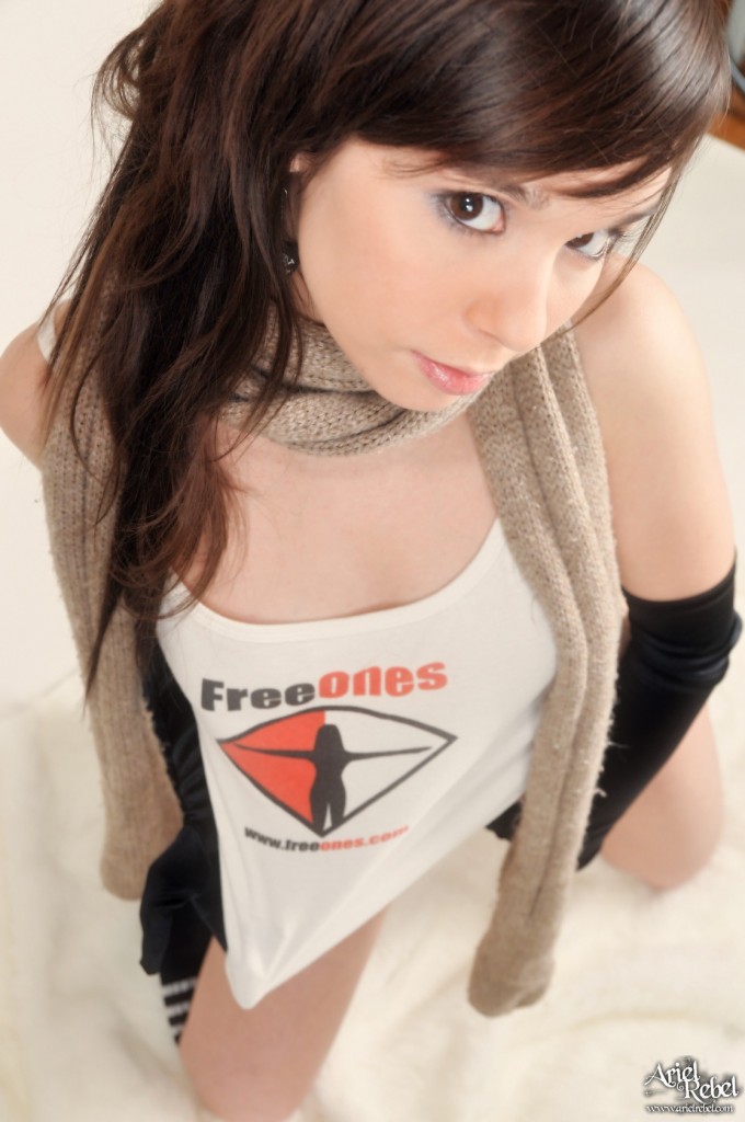 Frisky brunette teen, Ariel Rebel, takes her panties off to set her slit free.