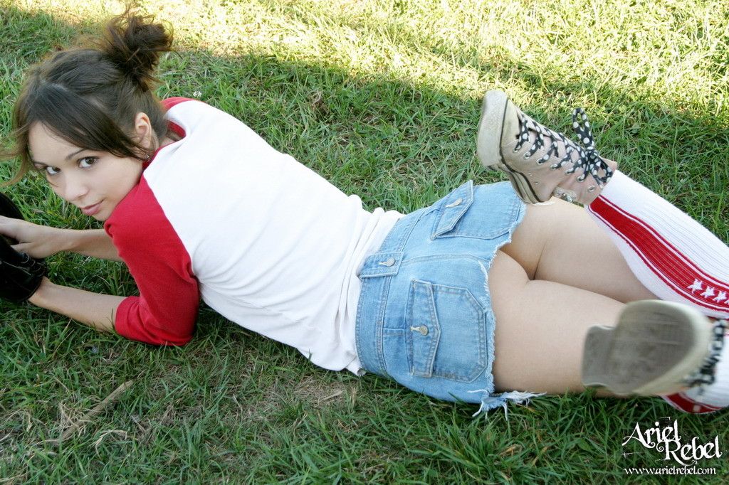 Sporty and sexy Ariel Rebel lies down on a lawn and shows her clean shaved pussy.