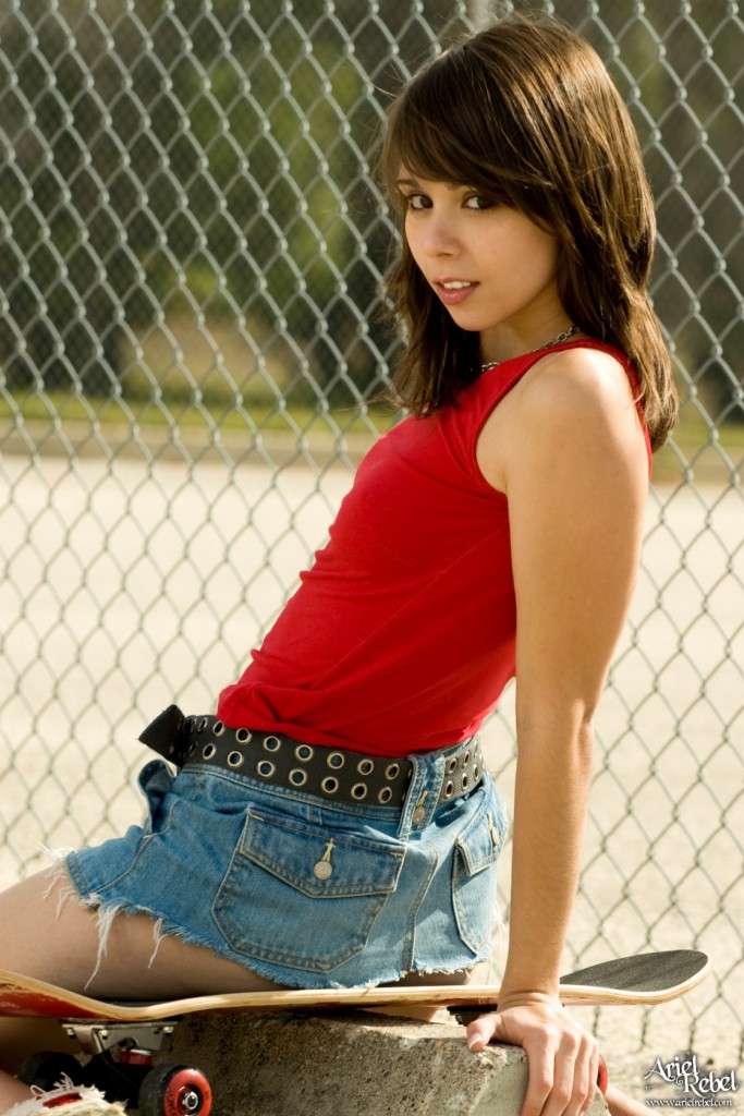 Naughty Ariel Rebel rides a skateboard in a very tiny mini skirt to show her slit.