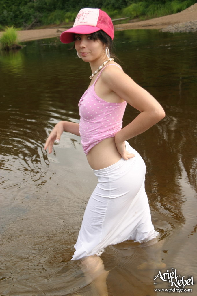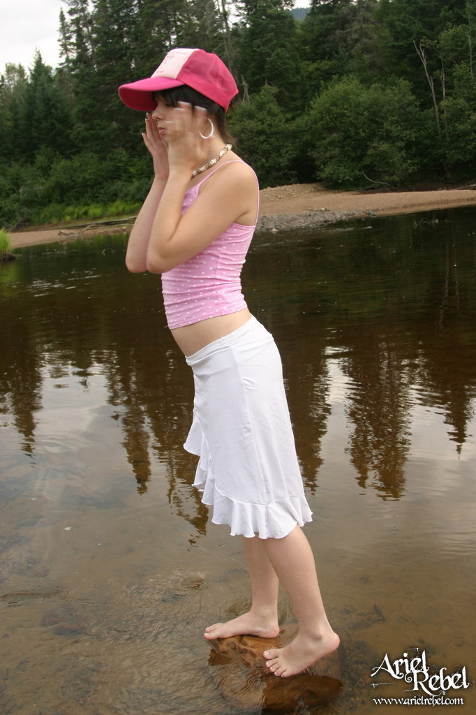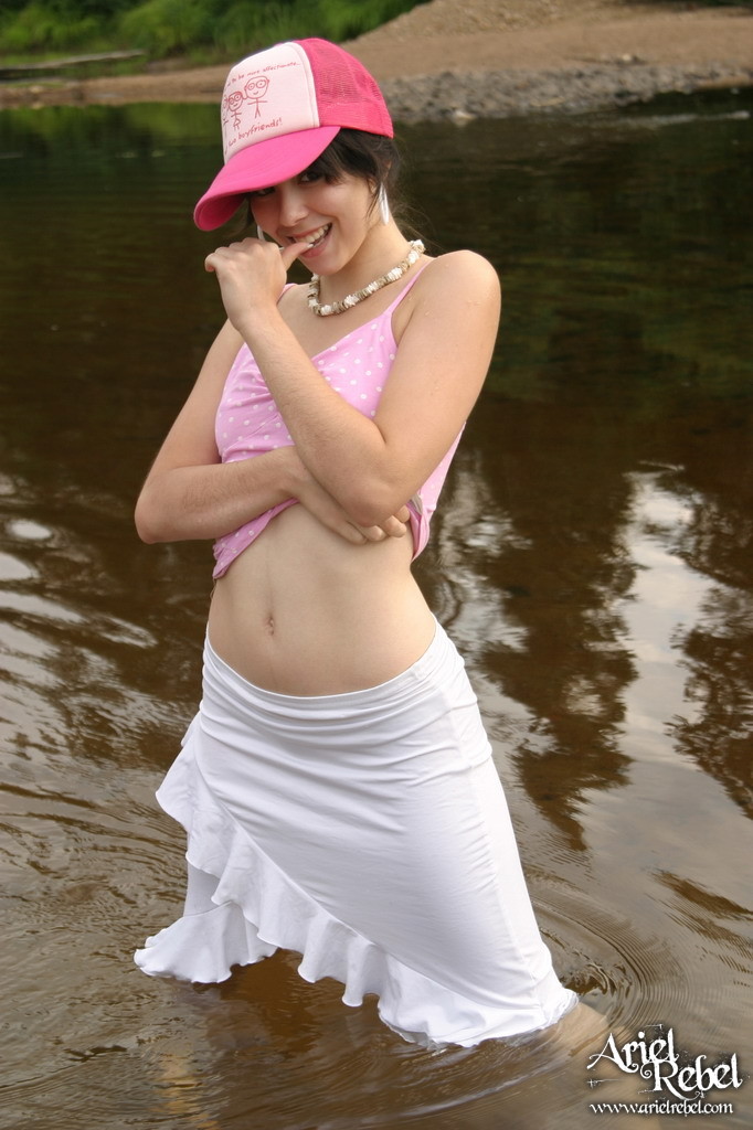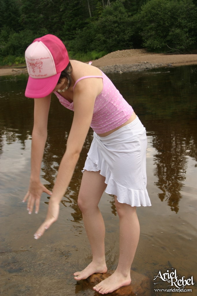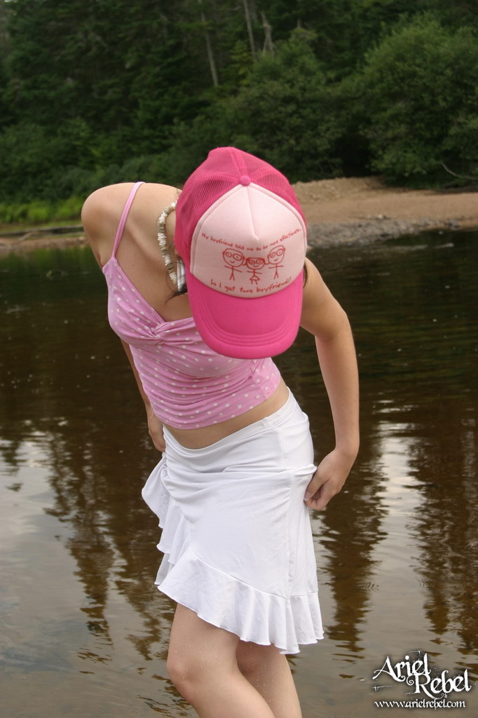 Ariel Rebel posing in her cute pink shirt and white skirt at the local lake.