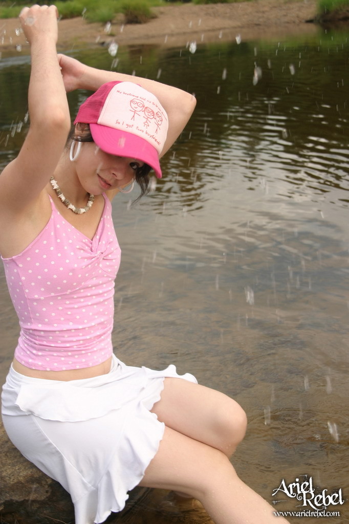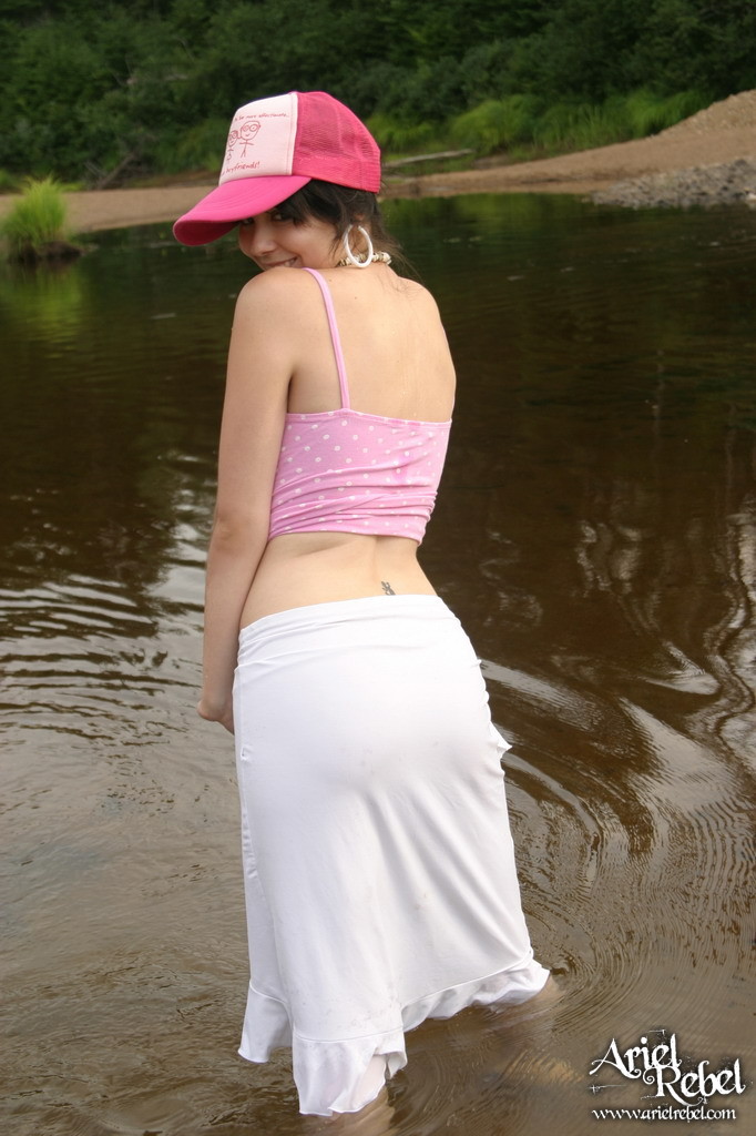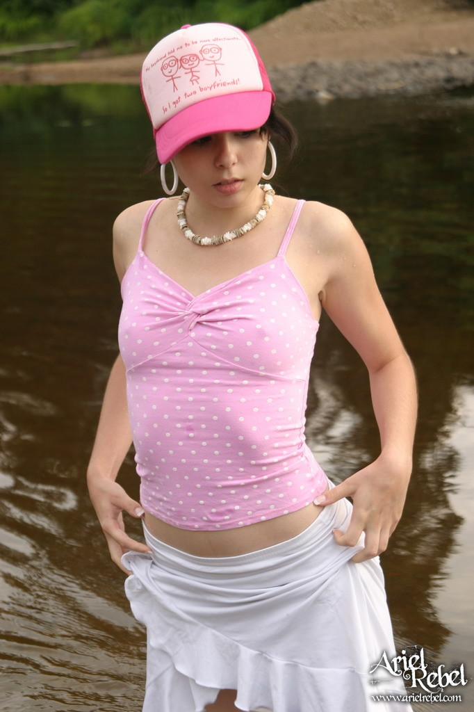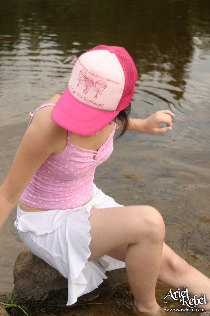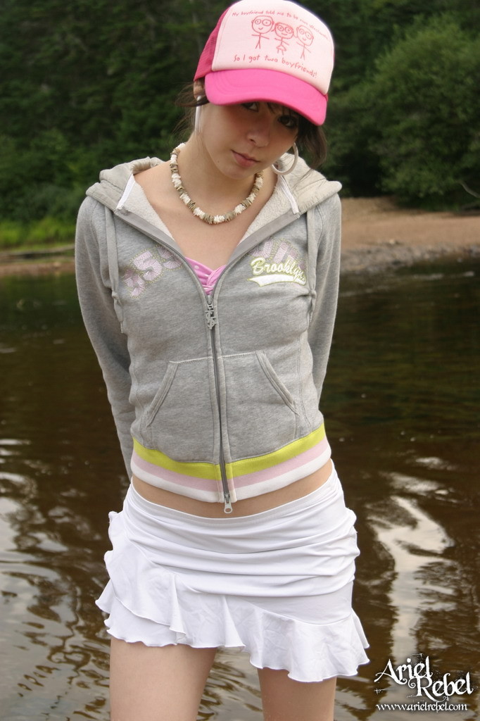Ariel Rebel posing in her cute pink shirt and white skirt at the local lake.