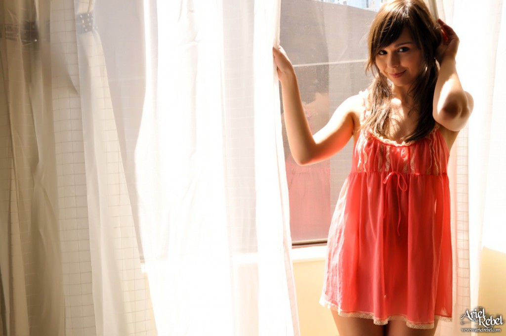 Sweet Ariel Rebel shows her new silk lingerie and her clean shaved pussy at once.