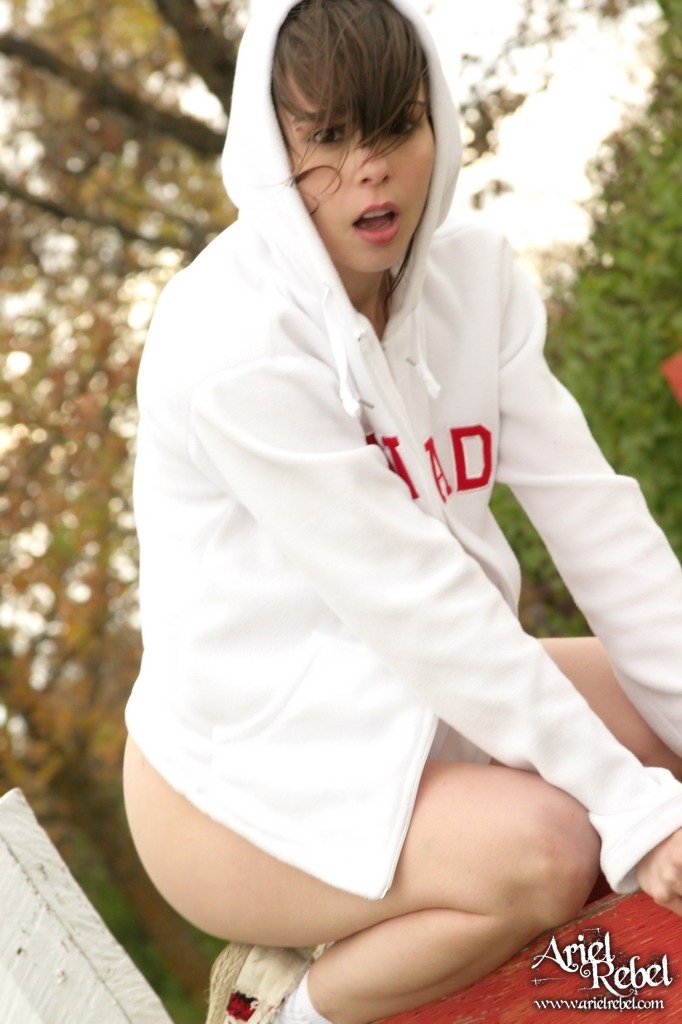 Ariel Rebel posing in whit shirt and showing her tiny tits and lickable shaved cunt.