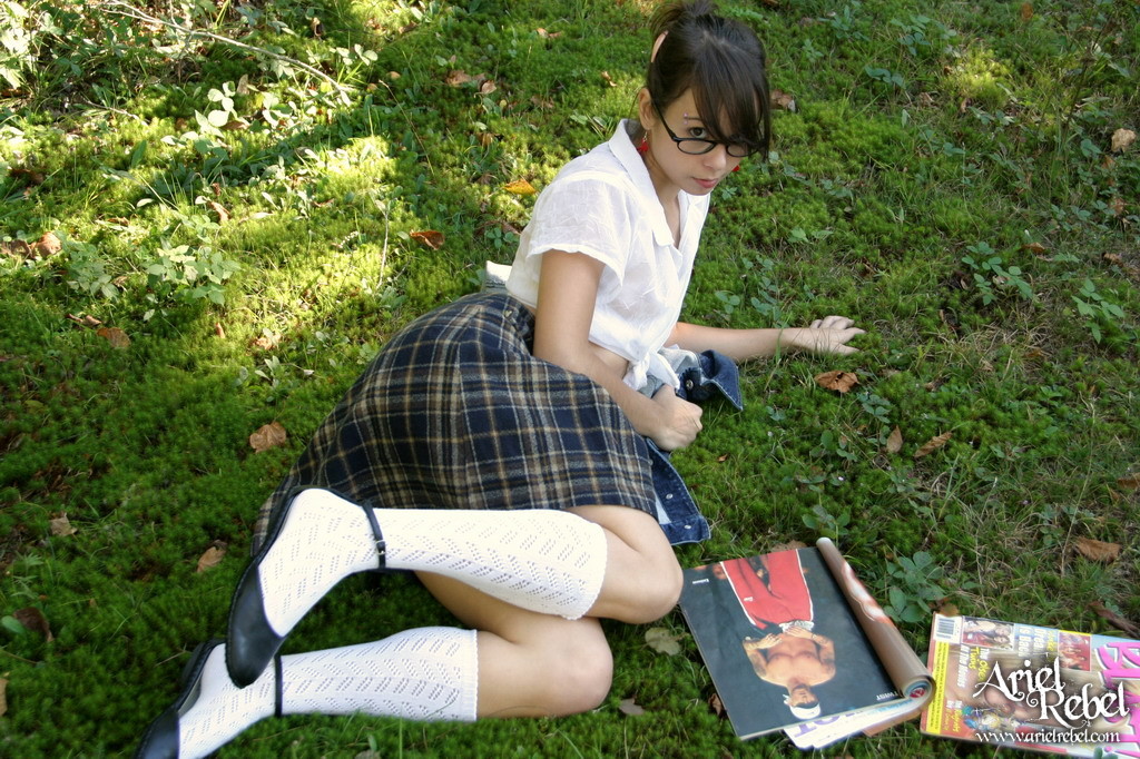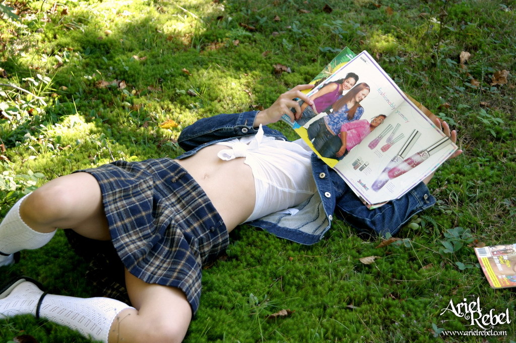 Sweet Ariel Rebel lies down on a lawn, reads a magazine and opens her slit even.