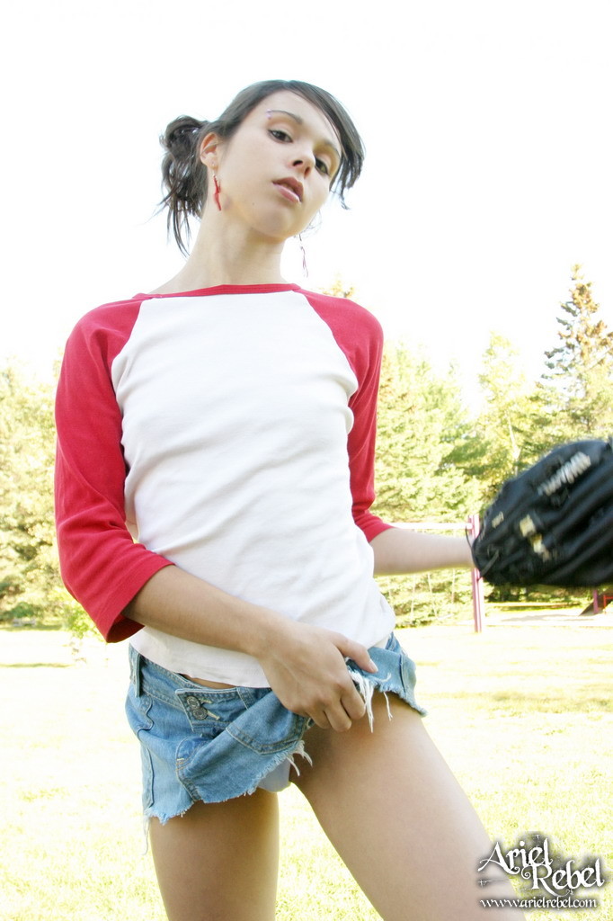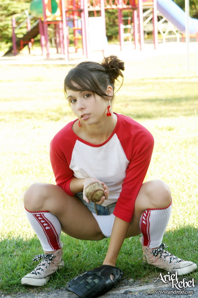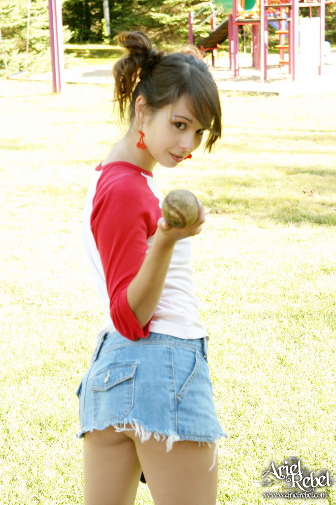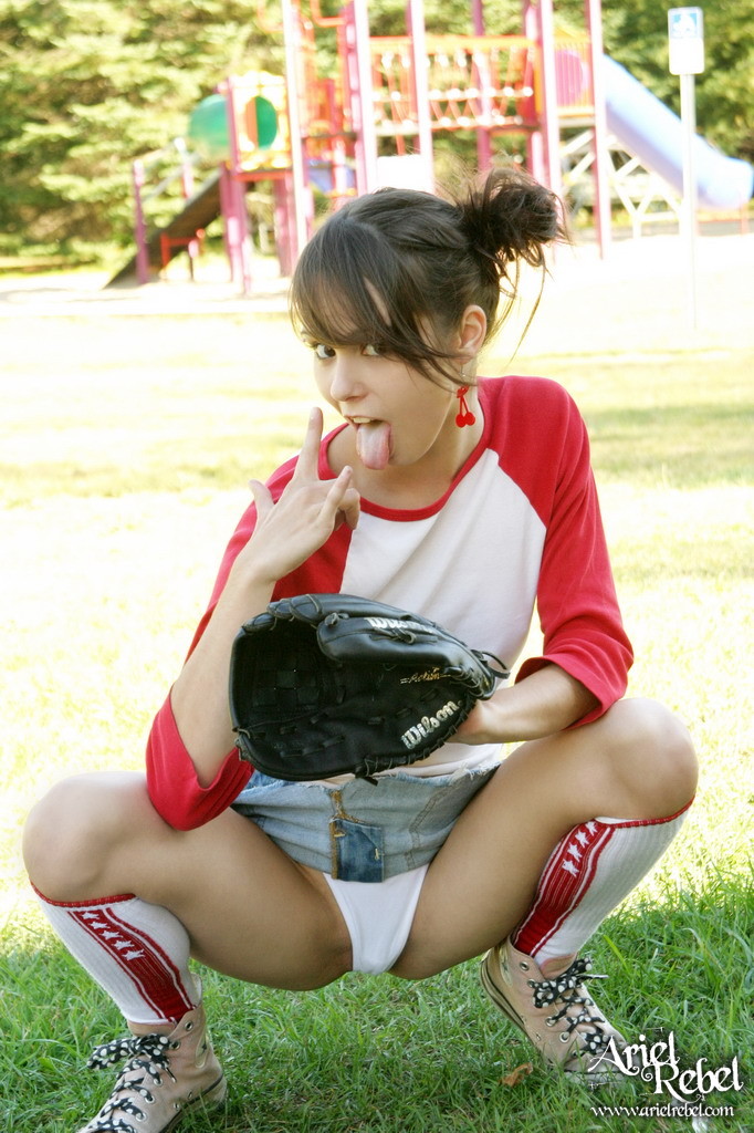 Ariel Rebel gets her tight white panties shot while playing baseball outdoors.