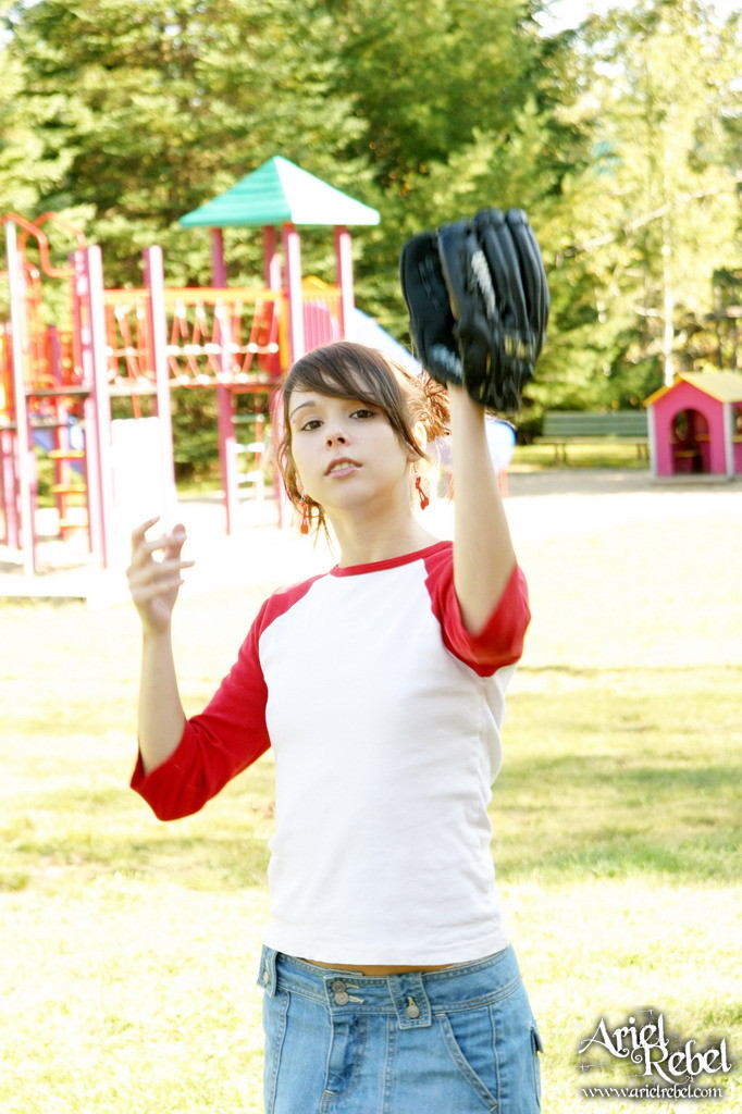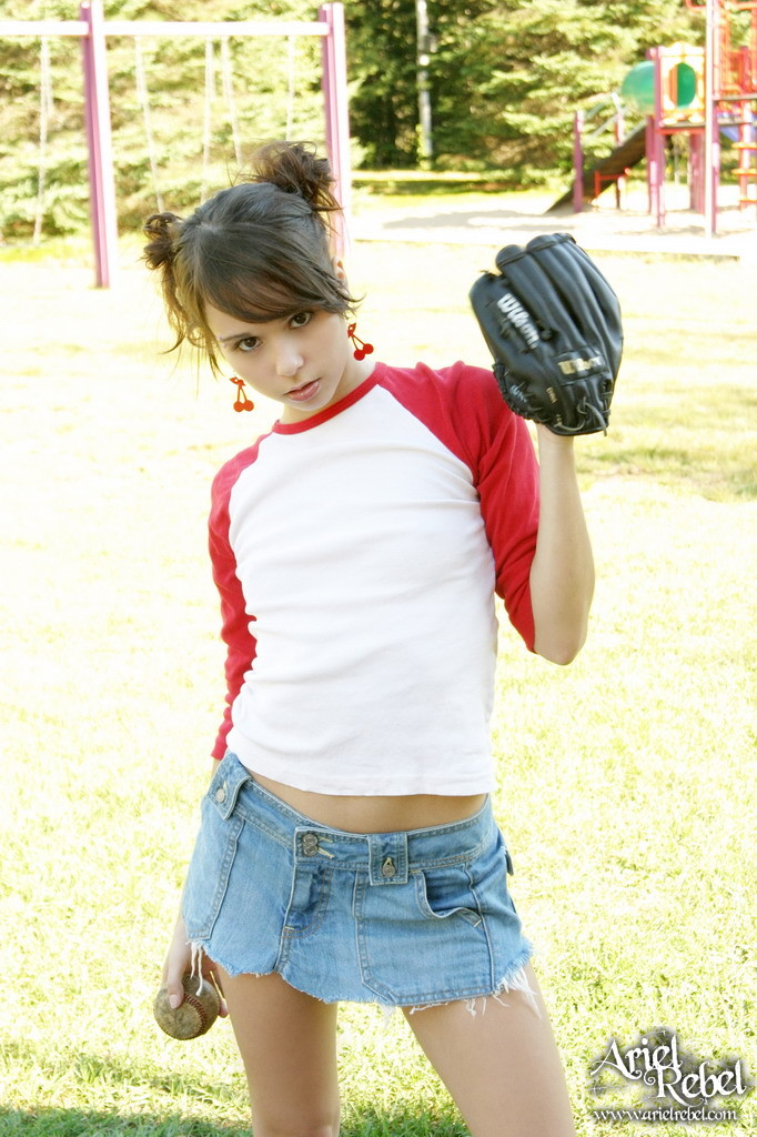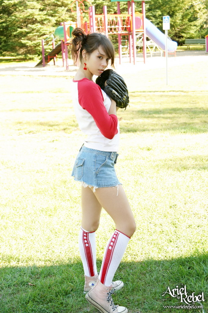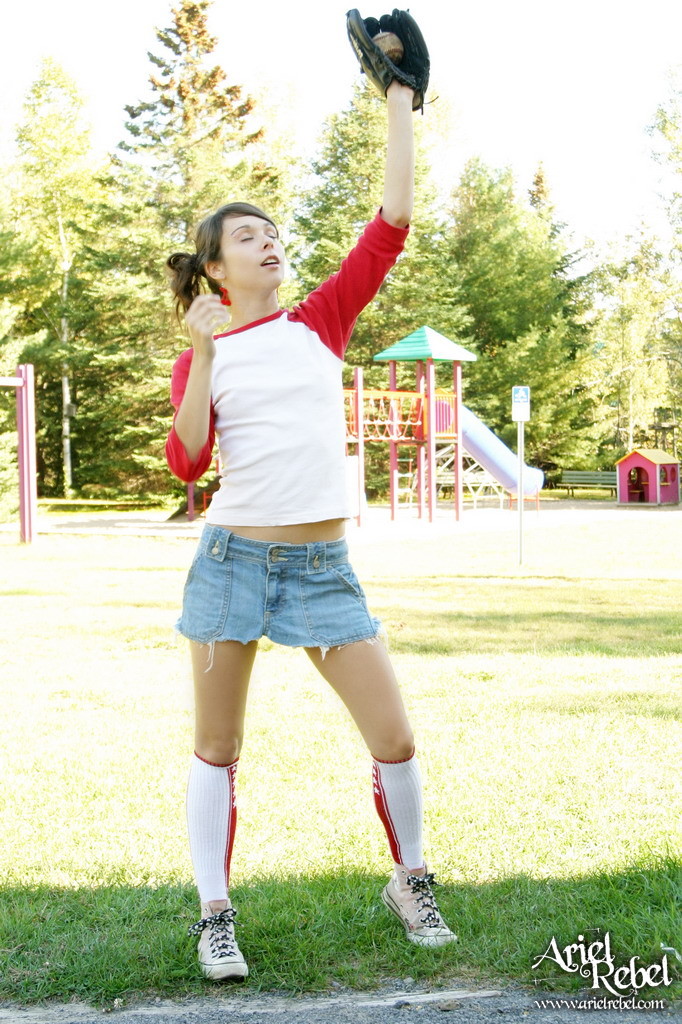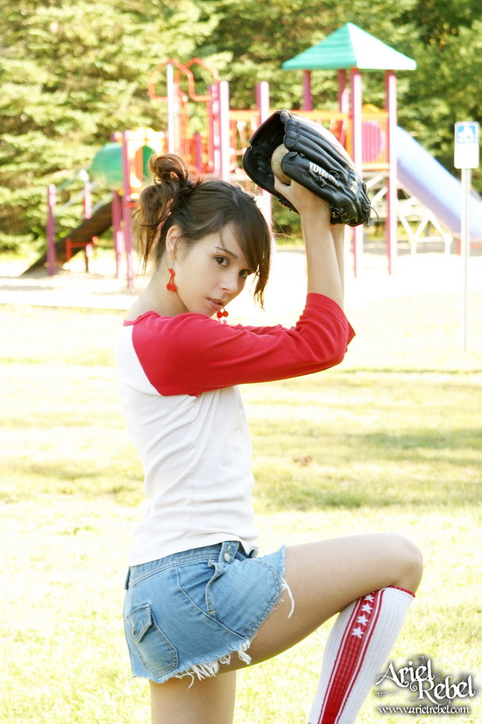 Ariel Rebel gets her tight white panties shot while playing baseball outdoors.