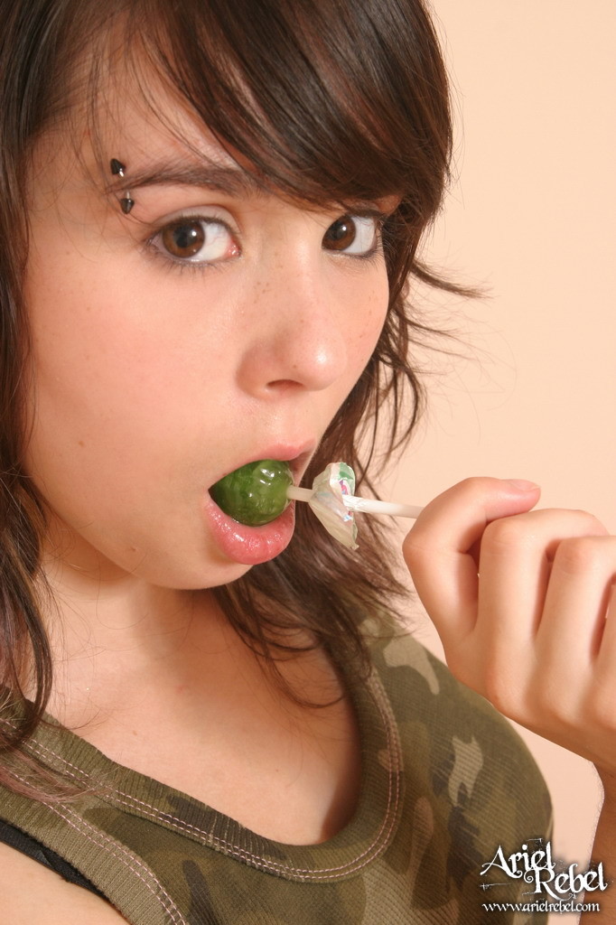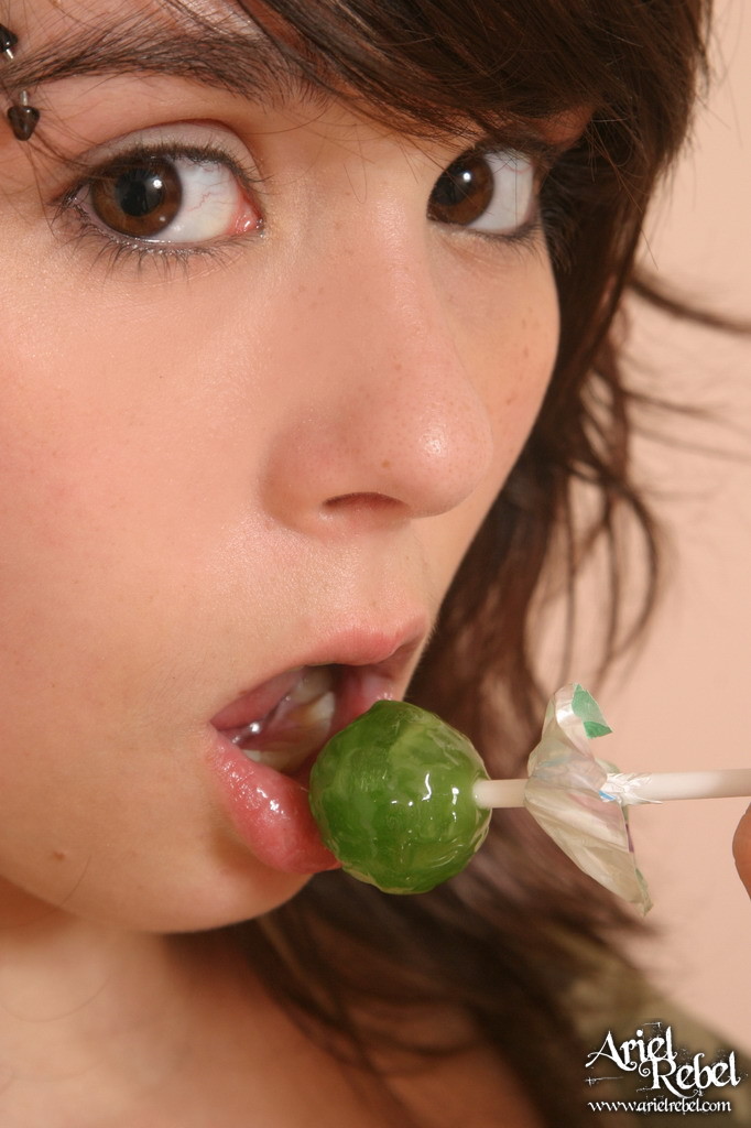 When Ariel Rebel gets tired, she sucks a lollipop and plays with her wet slit.