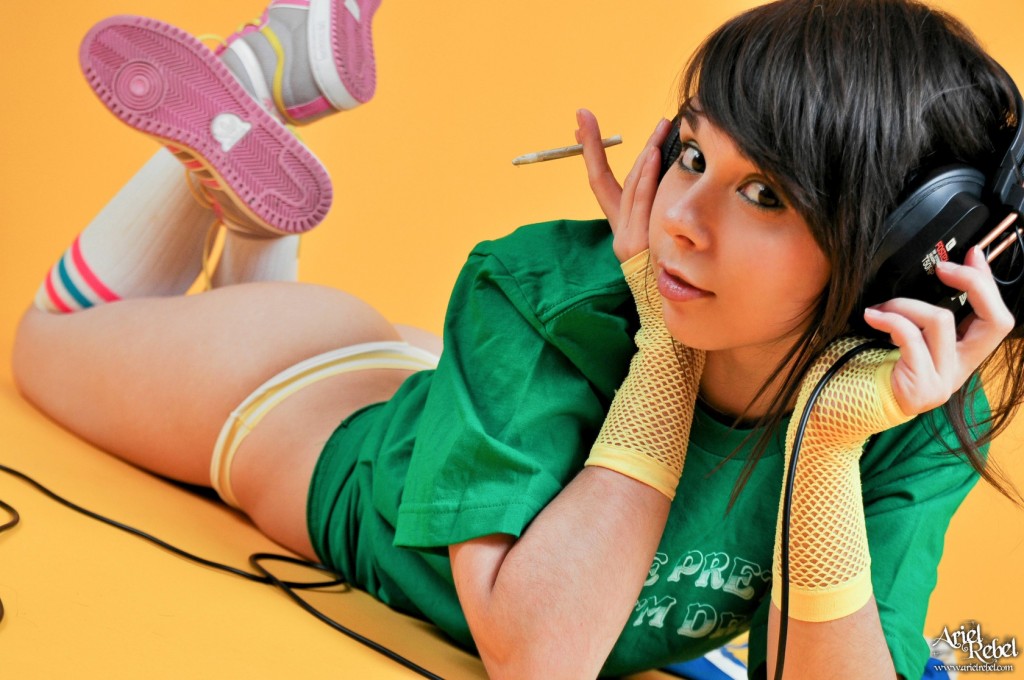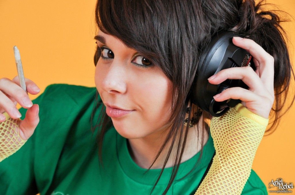Disobedient girl, Ariel Rebel, smokes a cigarette and listens to her favorite music.