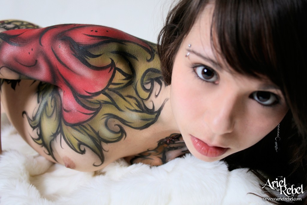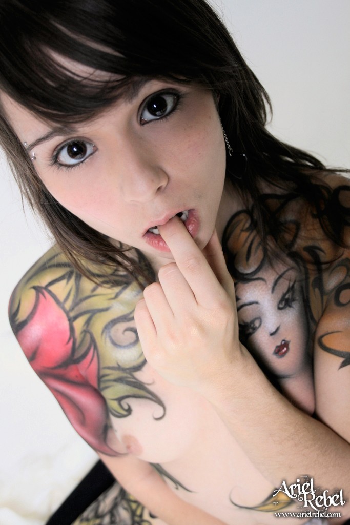 Ariel Rebel posing with her body full of fake tattooes and shows her tiny tits.