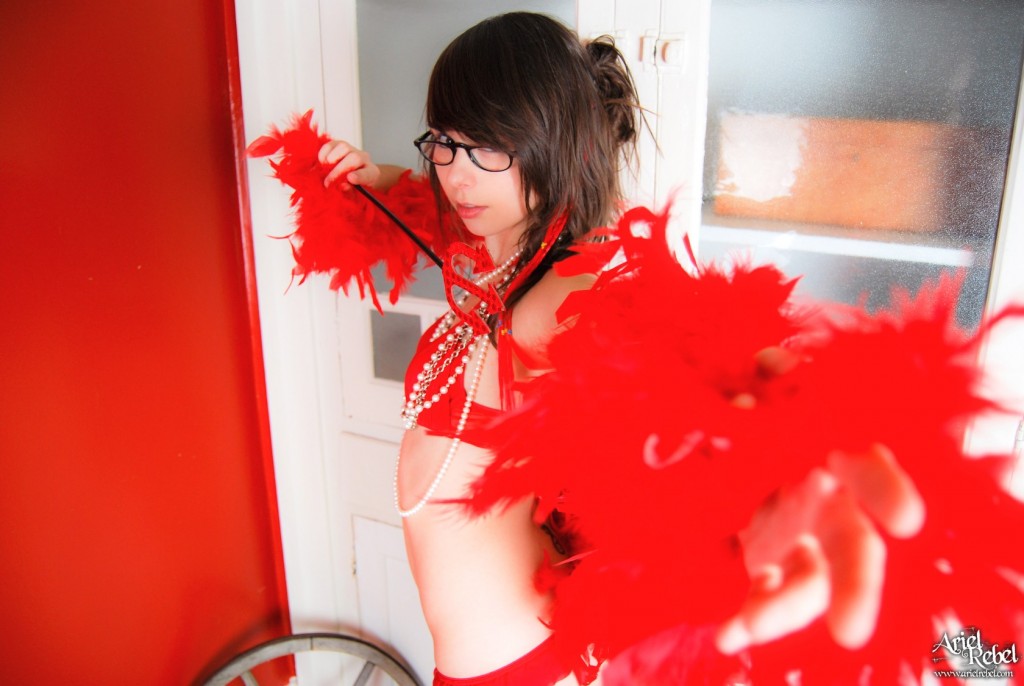 Stunning Ariel Rebel plays with a red boa and pearls as well as with her butt.
