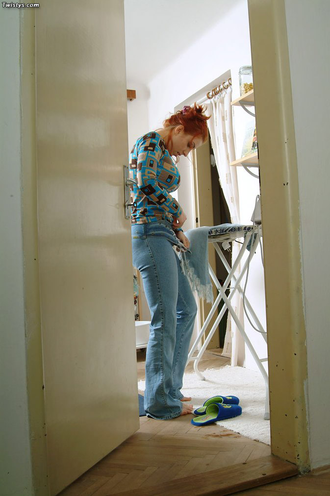 Randy redhead hottie Ashley Robbins taking jeans off and masturbating on floor.