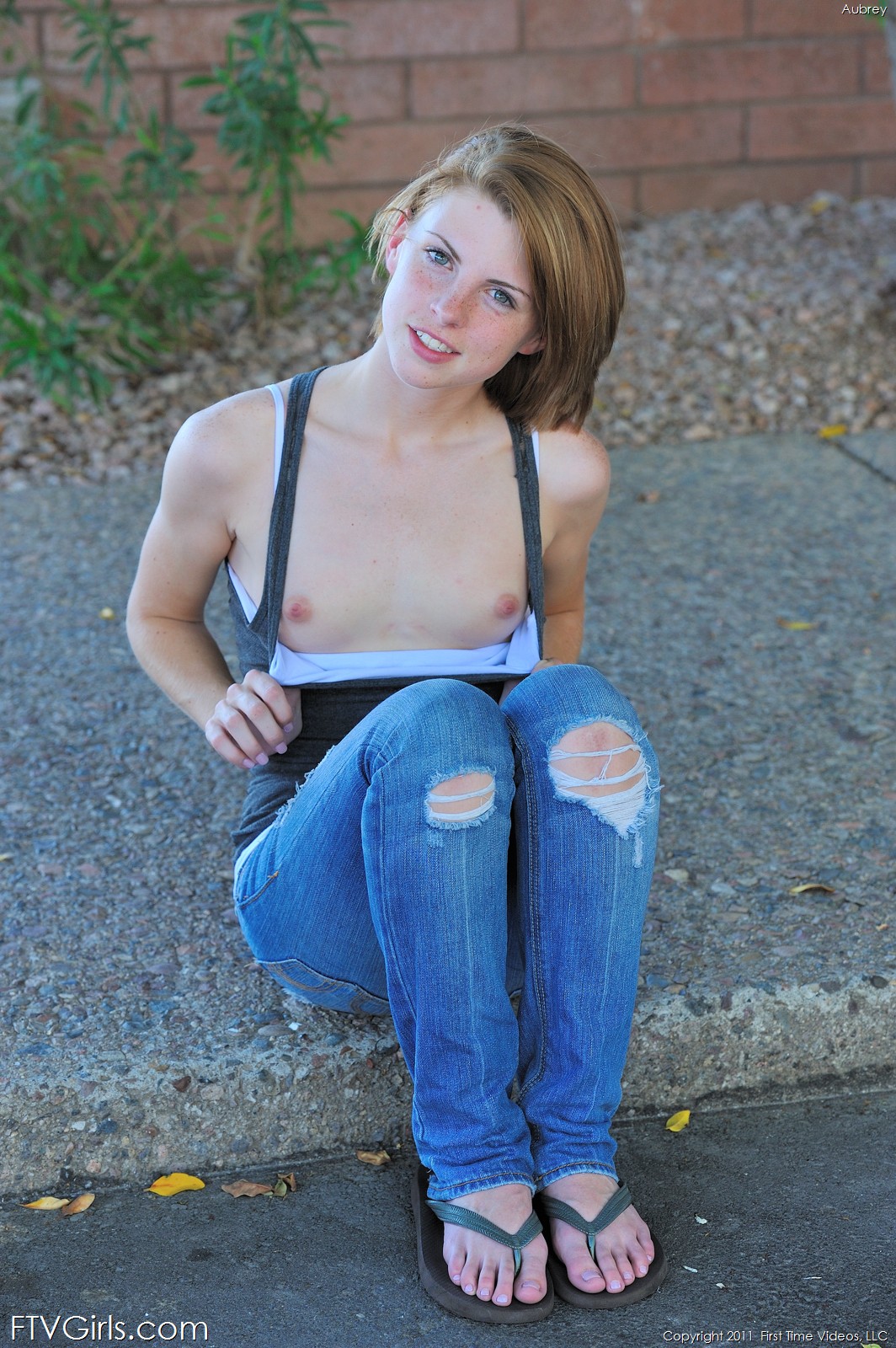 Aubrey Belle gets off her cute blue jeans and shows her nasty pussy outdoors.