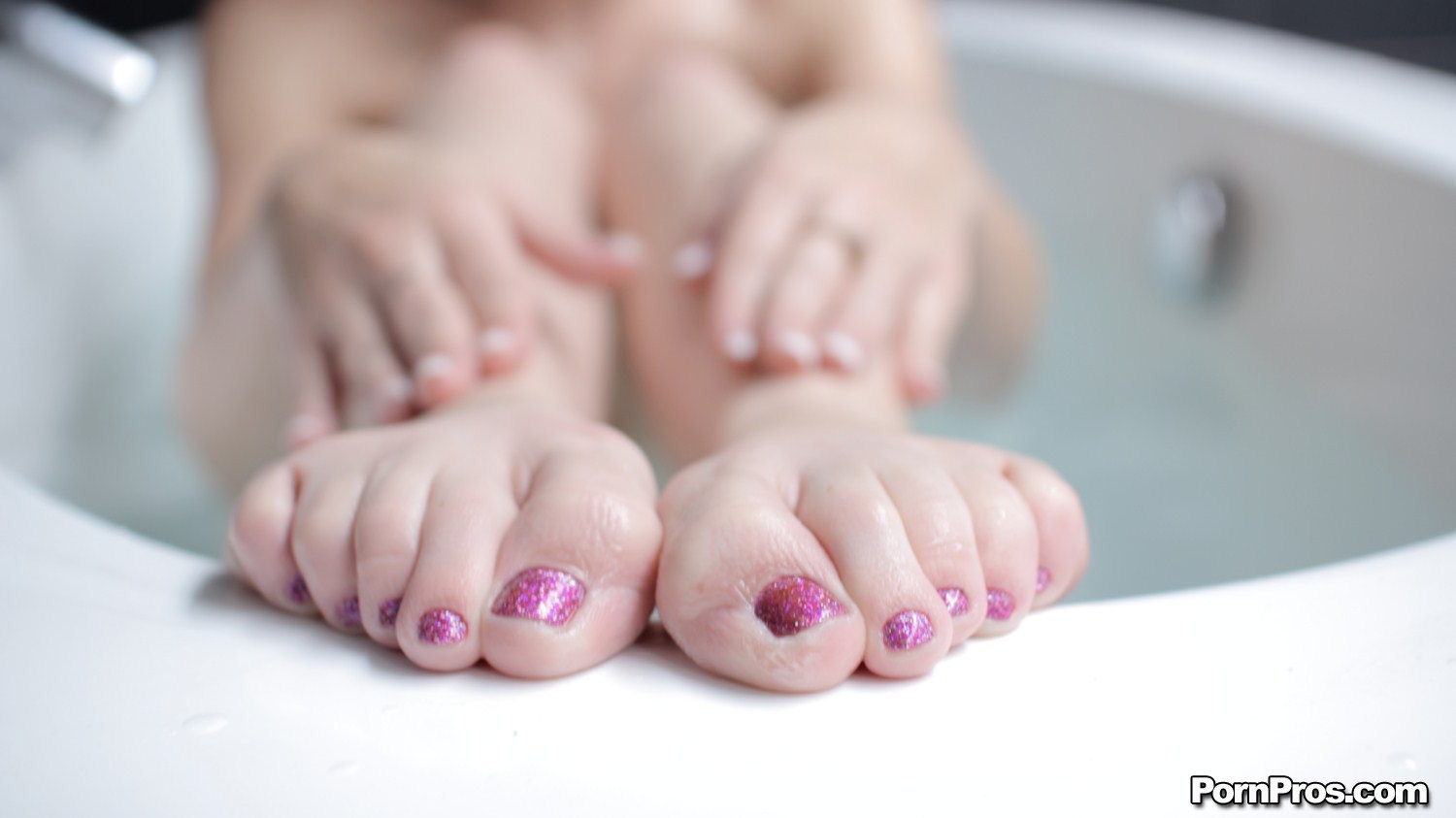 Sweetie takes bath when her blindfolded man comes to thrust cock into her wide-open mouth