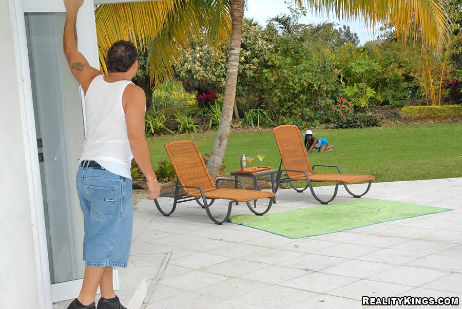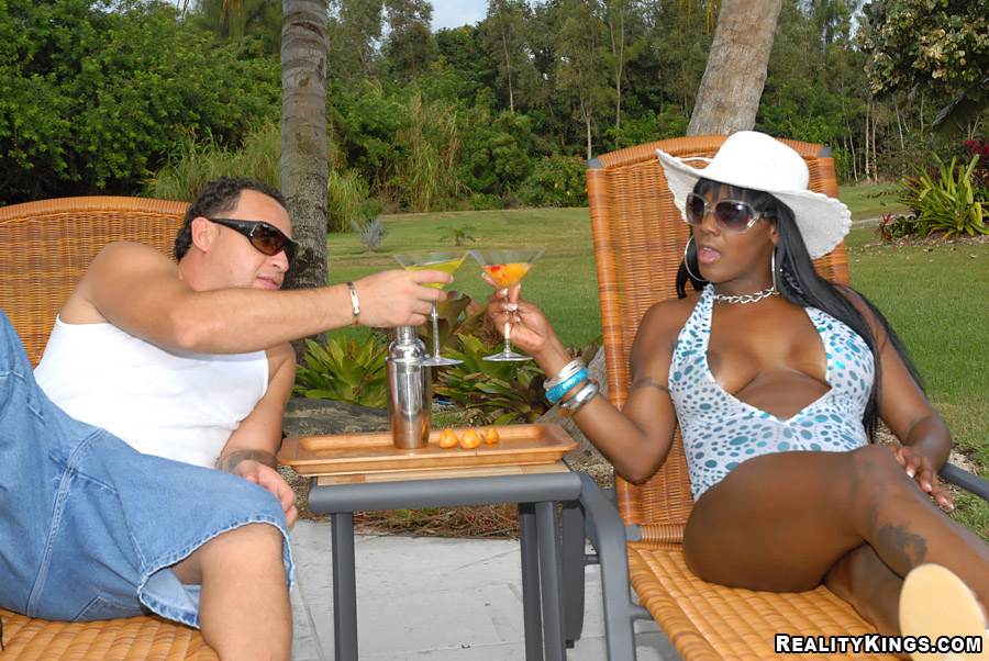 Slutty ebony hoe Barbie Banxxx strips by the pool and shows her big black booty.