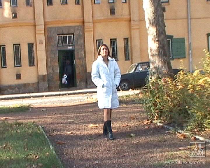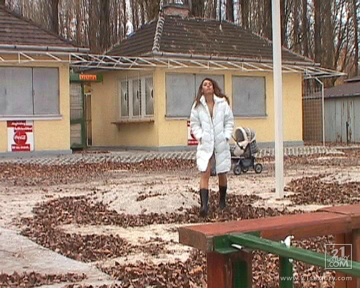 Betty Saint takes her sexy white coat off and teases us with her perky breasts.
